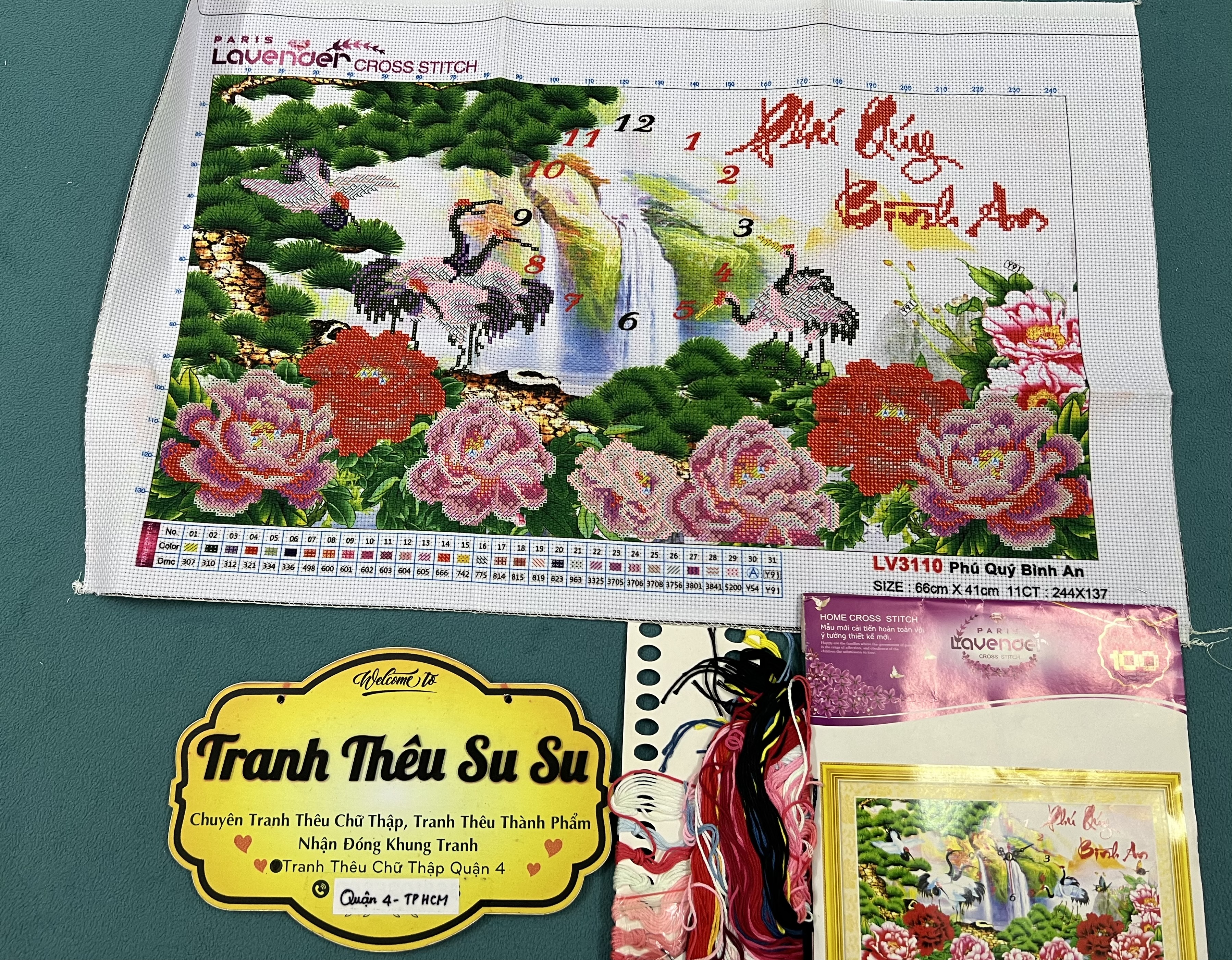Thêu chữ thập chữ h ( trong câu Phú Quý Bình An) thêu tranh chữ thập hoa mẫu đơn P5