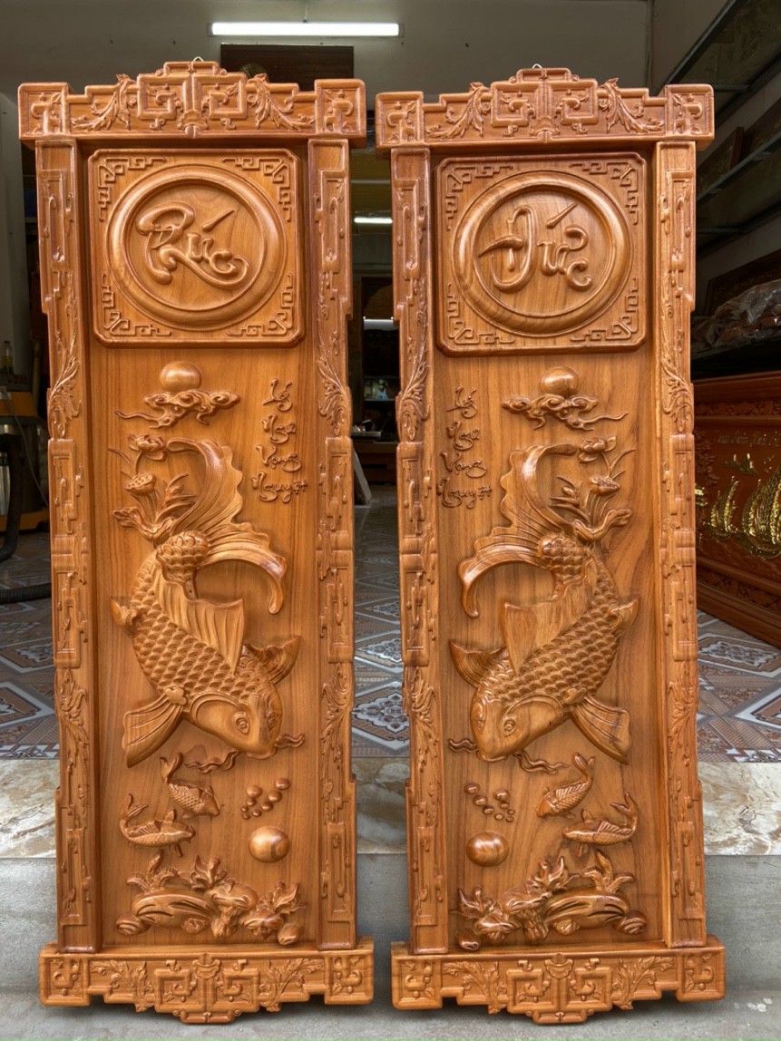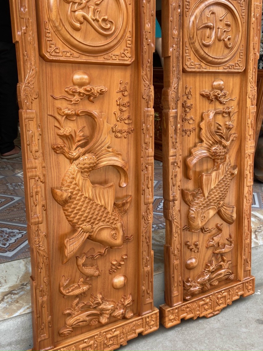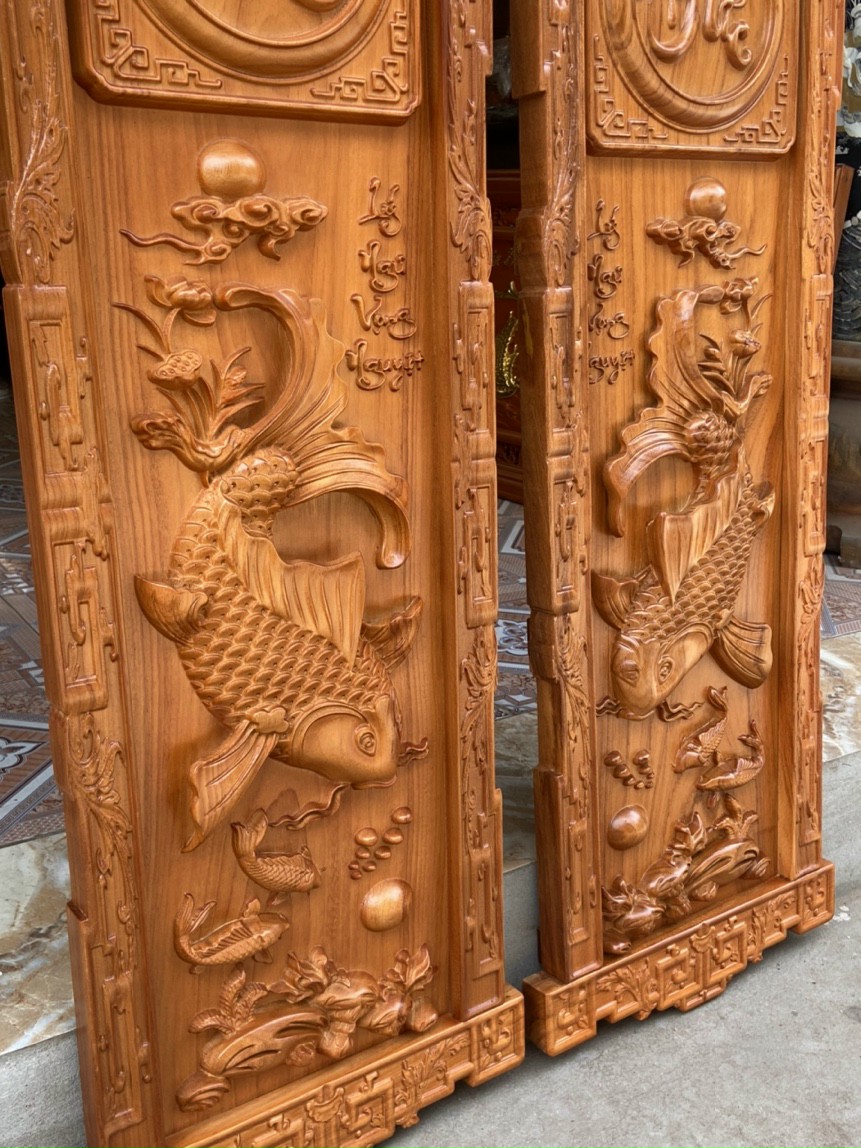 Tranh gỗ hương đục nổi mạ vàng - CẶP CÁ CHÉP -LÝ NGƯ VỌNG NGUYỆT Chất liệu gỗ hương liền khổi đục nổi 5D kênh bong , cực tinh xảo, mạ vàng sơn pu cao