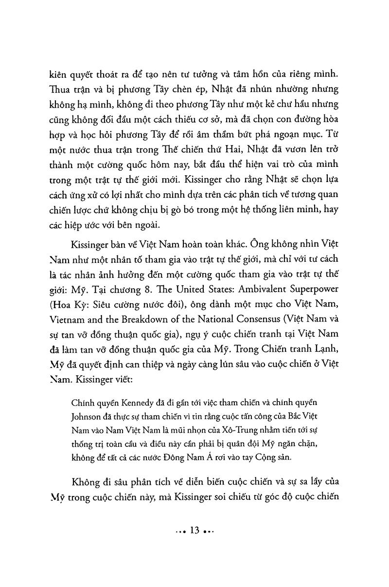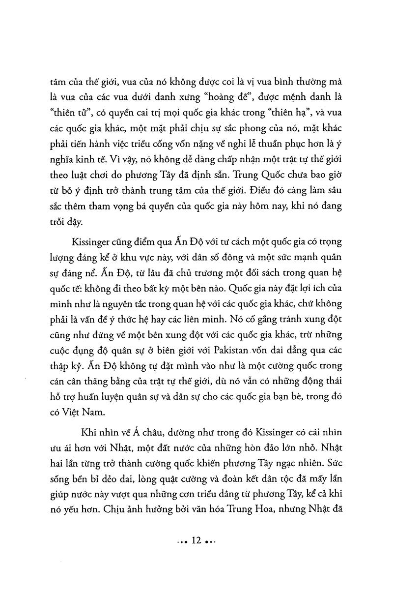 Mua tại TiktokTrật Tự Thế Giới (Tái Bản 2023) Trong tác phẩm, Kissinger xuất phát từ Hòa ước Westphalia để phân tích về tương quan giữa các nước, chủ yếu là các cường quốc và các khu vực giữ một vai trò đặc biệt đối với bức tranh địa chính trị thế giới, với những khác biệt trong thế giới quan và vị trí địa lý đã ảnh hưởng đến chính sách ngoại giao của mỗi nước như thế nào. Tác giả dành chương cuối (chương 9) để bàn về vấn đề toàn cầu hoá trong thời đại khoa học công nghệ, đặc biệt là tin học và truyền thông đại chúng lan tràn đã tác động mạnh mẽ đến dư luận, các nhà lãnh đạo và các quyết định chính trị hiện nay. Theo cách nhìn của Kissinger thì trật tự thế giới ngày nay cần được đặt trên hai yếu tố căn bản: