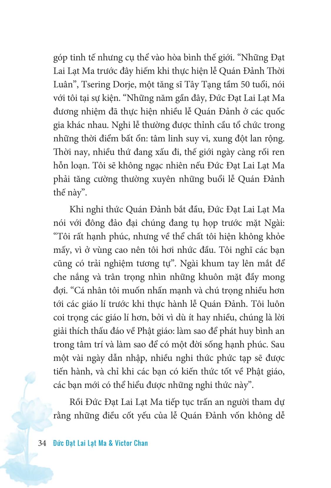 TRÍ TUỆ CỦA SỰ TỪ BI Nếu muốn chính mình hạnh phúc, hãy thực hành từ bi Nghiên cứu mới nhất trong khoa học thần kinh cho thấy rằng khi lòng từ bi có ở trong tâm trí chúng ta, nhiệt thành quan tâm về hạnh phúc, sự đau khổ, nỗi buồn của người khác, tinh thần cũng tăng một cách đáng kể. Đây được coi là dấu hiệu cho thấy những xúc cảm tích cực biểu hiện qua cảm xúc, sự nhiệt tình, lòng từ bi đang chảy trong người. Đức Đạt Lai Lạt Ma cho rằng từ bi chân chính không dựa trên những phóng chiếu và kì vọng của chúng ta mà dựa trên quyền lợi của người khác: bất kể người khác ấy là bạn thân hay kẻ thù, miễn rằng người ấy có ước vọng bình an và hạnh phúc cũng như ước vọng vượt thoát khổ đau, thì trên nền tảng đó chúng ta đều sẽ bày tỏ một sự quan tâm chân thành đối với các vấn đề của người ấy. Nếu bạn muốn người khác hạnh phúc, hãy thực hành từ bi. Vì thế Ngài đã nói rằng: “Nếu bạn muốn người khác hạnh phúc, hãy thực hành từ bi, nếu bạn muốn chính mình hạnh phúc, hãy thực hành từ bi”. Đức Đạt Lai Lạt Ma tin rằng mục đích của chúng ta trong cuộc đời này là hạnh phúc. Sau nhiều năm kiên trì, Ngài đạt tới một lãnh ngộ thâm sâu về lòng từ bi vào năm Ngài 32 tuổi. “Kể từ đó, tâm trí tôi trở nên thân thuộc với cảm xúc từ bi. Cảm xúc ấy rất mãnh liệt. Mỗi lần quán chiếu ý nghĩa và lợi lạc của tâm vị tha, tôi thường ứa lệ”. Đức Đạt Lai Lạt Ma đã đạt được một sự thấu triệt then chốt: bằng cách vun trồng lòng từ bi, chúng ta có được hạnh phúc tối thượng cho bản thân. Ngài gọi điều này là “vị kỷ thông tuệ”. “Giúp đỡ người khác không có nghĩa là chúng ta phải giúp họ mà bất chấp điều đó tổn hại đến chính mình”, Ngài nói: “Chư Phật và những bậc giác ngộ khác rất thông tuệ. Họ chỉ muốn một điều duy nhất suốt đời mình: có được hạnh phúc tối thượng. Vậy ta phải làm điều này bằng cách nào? Đó là bản thân trở nên vị tha, làm những điều tốt đẹp, khi biết giúp đỡ san sẻ niềm vui hay những gì mình học hỏi bản thân đạt được, hiểu biết cho người khác, chính chúng ta là người đầu tiên lợi lạc – chúng ta sẽ là người đầu tiên có được hạnh phúc tối đa. Để biết rằng, đôi khi giúp đỡ người khác chính là giúp đỡ chính bản thân mình, đó chính là trí huệ thực thụ”. Trí tuệ của sự từ bi - Sự từ bi sẽ dẫn đến sự an lạc Quyền sách “Trí tuệ của sự từ bi” mang đến dòng suy nghĩ, rèn luyện con người có lòng từ bi khi quan tâm kiên định giúp đỡ bất kể một ai sẽ đem đến chúng ta những điều lành, tốt đẹp. Đây là một cuốn sách về trí tuệ của lòng từ bi, về việc kiên định quan tâm tới người khác có thể dẫn lối chúng ta đến nguồn an lạc sâu xa ngần nào. Ấy là một cái nhìn sau bức màn nhung để hiểu được cách thức khó lòng bắt chước mà Đức Đạt Lai Lạt Ma nhận thức, biểu lộ và rèn luyện lòng từ bi. Ba phần của cuốn sách này phản ánh ý niệm về từ bi trong tư duy (Vượt thắng nghịch cảnh), lời nói (Tu dưỡng tâm), và hành động (Từ bi trong hành động). Phần Vượt thắng nghịch cảnh tái hiện lại các cuộc trò chuyện của Đức Đạt Lai Lạt Ma với các trẻ em đau bệnh, cựu tù, và nạn nhân của cuộc xung đột Bắc Ai-len. Ngài lắng nghe những trải nghiệm đau buồn của họ và giải thích rằng việc có một cái nhìn rộng mở có thể giúp chúng ta ứng phó với các thử thách. Thực hành từ bi không chỉ dừng ở chỗ chúng ta nghĩ về những ý nghĩ quan tâm. Đức Đạt Lai Lạt Ma khuyến khích chúng ta học hỏi một cách toàn diện – không chỉ cố gắng đạt thành tích học tập xuất sắc ở trường lớp, mà còn cần kết hợp với những giá trị của sự cảm thông và lòng vị tha. Trong phần Tu dưỡng tâm, Ngài trò chuyện với các học sinh trung học và chia sẻ những ý nghĩ của Ngài về cách chúng ta có thể chăm bón hạt giống từ bi suốt đời mình. Ngài gợi ý rằng nguyên do của phần lớn các vấn đề không nằm ở bên ngoài mà nằm bên trong chính tâm chúng ta. Giận dữ, chấp trước và vô minh là những nguồn cơn thực sự gây nên bất hạnh mà chúng ta phải chịu đựng.