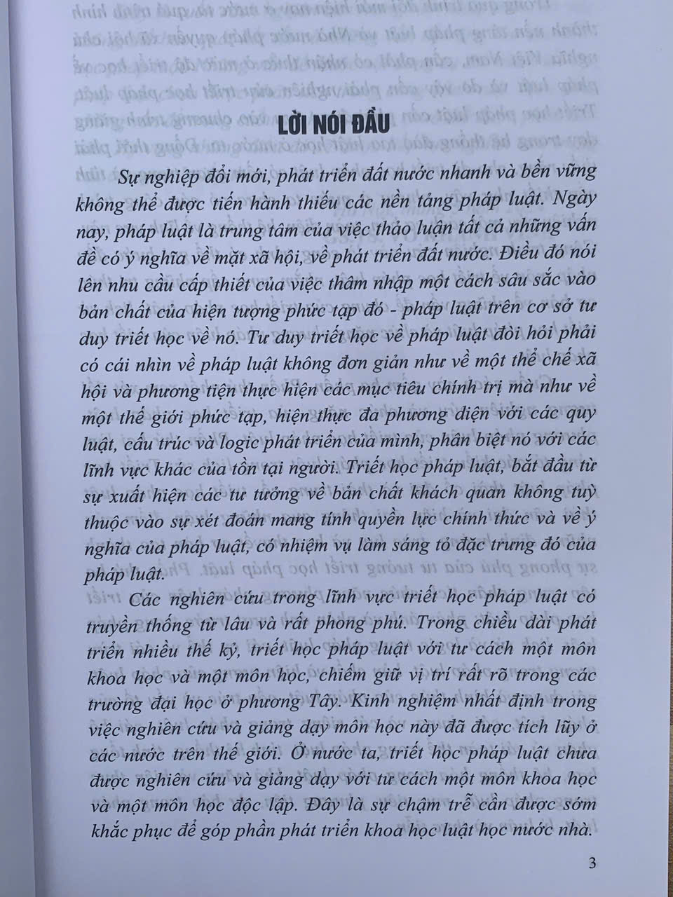 Sự nghiệp đổi mới, phát triển đất nước nhanh và bền vững không thể được tiến hành thiếu các nền tảng pháp luật. Ngày nay, pháp luật là trung tâm của việc thảo luận tất cả những vấn đề có ý nghĩa về mặt xã hội, về phát triển đất nước. Điều đó nói lên nhu cầu cấp thiết của việc thâm nhập một cách sâu sắc vào bản chất của hiện tượng phức tạp đó - pháp luật trên cơ sở tư duy triết học về nó. Tư duy triết học về pháp luật đòi hỏi phải có cái nhìn về pháp luật không đơn giản như về một thể chế xã hội và phương tiện thực hiện các mục tiêu chính trị mà như về một thế giới phức tạp, hiện thực đa phương diện với các quy luật, cấu trúc và logic phát triển của mình, phân biệt nó với các lĩnh vực khác của tồn tại người. Triết học pháp luật, bắt đầu từ sự xuất hiện các tư tưởng về bản chất khách quan không tuỳ thuộc vào sự xét đoán mang tính quyền lực chính thức và về ý nghĩa của pháp luật, có nhiệm vụ làm sáng tỏ đặc trưng đó của pháp luật.