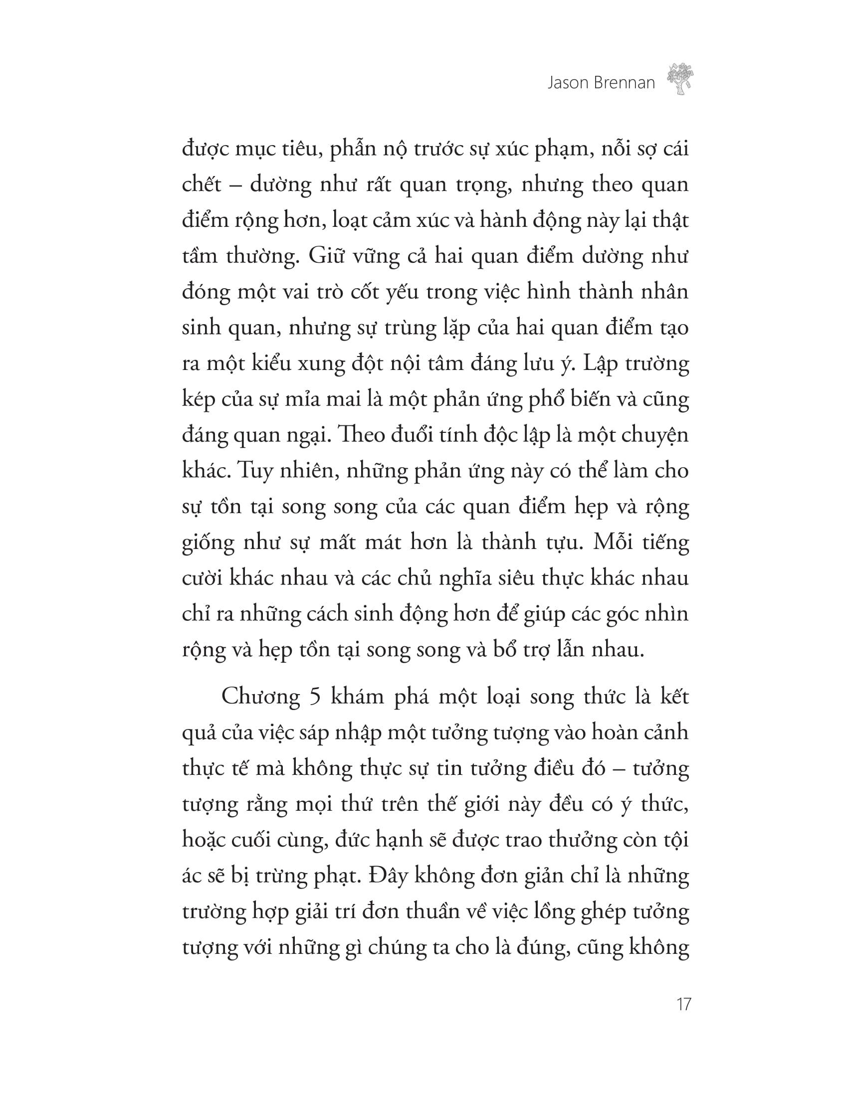 Tuy nhiên, như Jennifer Church lập luận trong cuốn sách này, xung đột nội tâm có thể là một điều tốt, và nó không chỉ là một ngã rẽ tạm thời trên con đường đến với giải pháp. Cuốn sách này mô tả một vài kiểu mẫu của “lý trí kép” và giải thích tại sao cũng như làm thế nào để trạng thái này được duy trì. Church xem xét kỹ lưỡng một số ý tưởng phổ biến về bản sắc, bao gồm niềm tin cho rằng cuộc sống của chúng ta nên “có ý nghĩa” như một câu chuyện. Bà cũng xem xét tính hữu ích của lòng thấu cảm đối với ý thức kép, và các hình thức mỉa mai châm biếm và tiếng cười giúp chúng ta hưởng lợi ra sao từ việc giữ vững các quan điểm đối lập. Cuối cùng, Church mở ra tia hy vọng khi gợi ý chúng ta nên biết chấp nhận thực tế trong khi thi thoảng cũng nên được dẫn dắt bởi trí tưởng tượng.