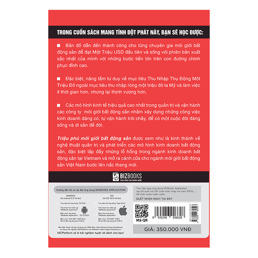 Nghề bất động sản – lựa chọn hoàn hảo cho bất kỳ người nào có máu kinh doanh và nhiều tham vọng Với chi phí khởi nghiệp tương đối thấp và không có mức trần cứng nhắc giới hạn thu nhập, nghề bất động sản dường như là lựa chọn hoàn hảo cho bất kỳ người nào có máu kinh doanh và nhiều tham vọng. Trong ngành này, bạn tự định ra hạn mức cho mình. Cách tiếp cận, khả năng và niềm đam mê môi giới bất động sản sẽ là những nhân tố quyết định lớn nhất cho thành công của bạn. Với “Triệu phú môi giới bất động sản”, bạn sẽ được trả lời câu hỏi quan trọng nhất mà bất kỳ ai làm môi giới bất động sản cũng có thể đã từng tự hỏi mình: “Làm thế nào tôi, với tư cách là người môi giới bất động sản, có thể tăng thu nhập của mình lên đến mức cao nhất có thể?” Trong cuốn sách này, tác giả sẽ trình bày với bạn cách suy nghĩ giống như một Triệu phú môi giới bất động sản. Sau đó, chúng tôi sẽ chỉ cho bạn biết, từng bước một, cách kiếm được một triệu đô la thu nhập ròng mỗi năm. Cuối cùng, chúng tôi sẽ chỉ ra con đường phải đi để nhận được một triệu đô la thu nhập thụ động(1) Triệu phú môi giới bất động sản được xem như là kinh thánh về nghệ thuật quản trị và phát triển các mô hình kinh doanh bất động sản, đặc biệt lấp đầy những lỗ hổng trong ngành kinh doanh bất động sản tại Việt Nam. Trên thế giới cũng như tại Việt Nam, chưa có chuyên gia nào như Gary Keller nói rõ và chi tiết về từng bước xây dựng và tăng trưởng đạt đến những thành công vang dội như vậy trong Triệu phú môi giới bất động sản. Triệu phú môi giới bất động sản được viết riêng cho những người có tinh thần làm việc tận tụy và dám mạo hiểm để trở thành những người tiên phong trong lĩnh vực kinh doanh của mình – sách này dành tặng riêng cho các chuyên gia môi giới bất động sản ở khắp mọi nơi trên thế giới. “Sách Đỏ: của chuyên gia bất động sản khắp nơi trên thế giới Trong cuốn sách mang tính đột phá này, bạn sẽ học được:
