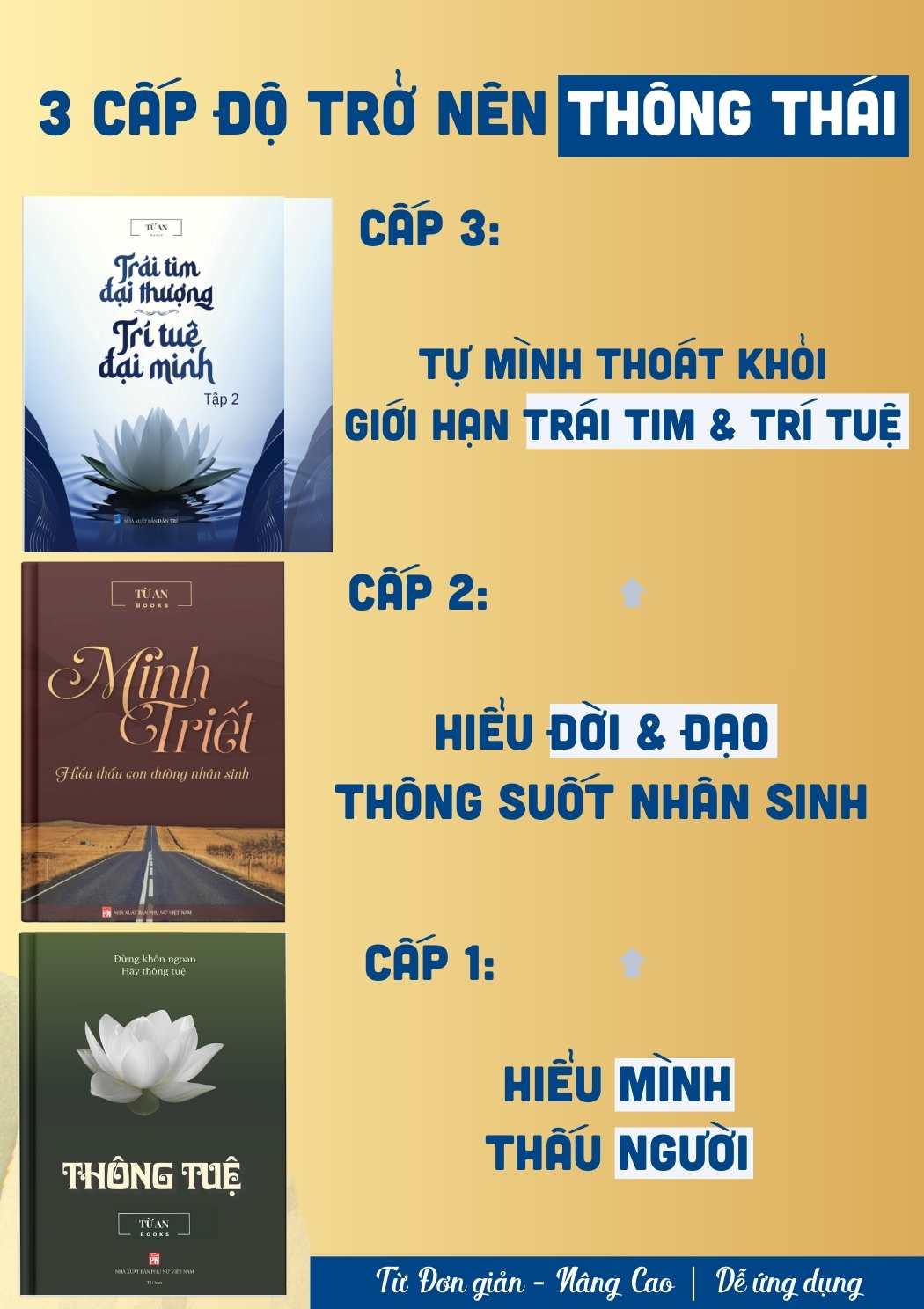 SÁCH THÔNG TUỆ - MINH TRIẾT Đây là cuốn sách đặc biệt dành cho những người trí tuệ, không những giúp người đó thông suốt mọi thứ mà còn phá bỏ giới hạn của trí tuệ tầm thường, trở nên thông tuệ. Xuyên suốt cuốn sách là sự logic và liên kết giữa các vấn đề, giúp người đọc có cái nhìn vừa sâu sắc, vừa toàn diện về cuộc sống. Nếu bạn có thể đọc và hiểu hết cuốn sách này, cũng giống như bạn đã đọc và hiểu 50 cuốn sách hay về minh triết cuộc sống, cuốn sách được viết vô cùng ngắn gọn và sâu sắc. Với lối viết đi đúng trọng tâm, phân tích bản chất mọi thứ bằng sự logic, cùng những ví dụ hóm hỉnh của tác giả. Giúp người đọc dễ hiểu và dễ dàng vận dụng vào cuộc sống. Cuốn sách cũng giúp những người theo tôn giáo biết tại sao mình không có nhiều tiến triển trên hành trình tâm linh, từ đó giúp tháo bỏ những điểm tắc nghẽn và trở nên thông suốt. Nói về con đường mà tất cả nhân sinh đều phải đi qua Từng giai đoạn có đặc điểm thế nào và làm sao để bạn có thể đi tới đó. Tại sao bản thân và người khác lại có những suy nghĩ, hành động, tư tưởng như vậy. Suy nghĩ, cảm xúc, niềm tin tới từ đâu và chúng ẩn chứa điều gì. Cuốn sách có năng lượng chữa lành. Nội tâm đang bị những năng lượng nào chiếm đóng, phương pháp để đối phó và làm chủ cuộc đời. Tại sao những người giàu có và quyền lực cũng bị những năng lượng này lừa dối, chúng xuất hiện khi nào và cách chi phối cảm xúc, suy nghĩ, hành động, chất lượng cuộc sống… của ta từng giây, từng phút. Chặng đường đời và đạo sẽ dẫn chúng ta tới đâu. Nhiều câu hỏi thú vị của nhân sinh, câu hỏi được chọn lọc từ danh sách các câu hỏi của độc giả khắp muôn nơi khi gửi về cho tác giả, sẽ được tác giả trả lời chi tiết và cụ thể.   SÁCH ĐẠI THƯỢNG - ĐẠI MINH 1: Biết cách để thoát khỏi những giới hạn của trí tuệ, tâm trí, để có được trí tuệ người đại minh, trí tuệ này còn vượt cả kinh nghiệm dày dặn của người từng trải. 2: Phá vỡ giới hạn của sự sáng tạo bên trong, ứng dụng sáng tạo vô tận vào công việc, đời sống. 3: Từng bước tìm ra đam mê của cuộc đời, mỗi sáng thức dậy luôn nhiệt huyết và đầy hạnh phúc vì ngày mới được tiếp tục sống trong đam mê của mình. 4: Hiểu rõ niềm vui thoáng qua và chân hạnh phúc, cách để có được chân hạnh phúc, tìm thấy giá trị của cuộc đời. 5: Biết cách để đi đúng hướng, không lãng phí thời gian và cuộc đời vào những định hướng sai lầm, thời gian và cơ hội không thể lấy lại. 6: Nhìn ra sức mạnh của trái tim, giúp trí tuệ thăng hoa, cách để trái tim và trí tuệ thoát khỏi sự tầm thường của chính nó. 7: Làm sao để làm chủ tư tưởng/cảm xúc/hành động của mình, như vậy mới có thể làm chủ cuộc đời mình. 8: Đâu là đức của con người, đâu là đạo lý trời đất, thiên thời - địa lợi tới từ đâu .