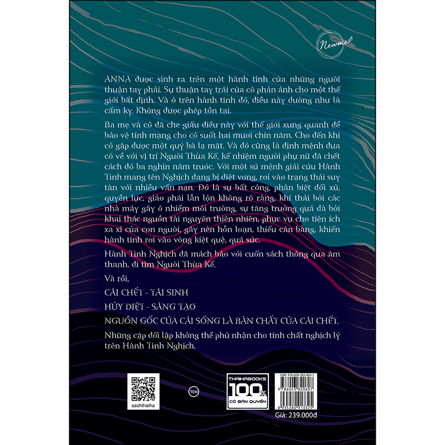 ANNA được sinh ra trên một hành tinh của những người thuận tay trái. Sự thuận tay trái của cô phản ảnh cho một thế giới bất định. Và ở trên hành tinh đó, điều này dường như là một cấm kỵ. Không được phép tồn tại. Ba mẹ và cô đã che giấu điều này với thế giới xung quanh để bảo vệ tính mạng cho cô suốt hai mươi chín năm. Cho đến khi cô gặp được một quý bà lạ mặt. Và đó cũng là định mệnh đưa cô về với vị trí Người Thừa Kế, kế nhiệm người phụ nữ đã chết cách đó ba nghìn năm trước. Với một sứ mệnh giải cứu Hành Tinh mang tên Nghịch đang bị diệt vong, rơi vào trạng tái suy tàn với nhiều vấn nạn. Đó là sự bất công, phân biệt đối xử, quyền lực, giáo phái lẫn lộn không rõ ràng, khí thải bởi các nhà máy gây ô nhiễm môi trường, sự tăng trưởng quá đà bởi khai thác nguồn tài nguyên thiên nhiên, phục vụ cho tiện ích xa xỉ của con người, gây nên hỗn loạn, thiếu cân bằng, khiến hành tinh rơi vào vòng kiệt quệ, quá sức. Hành Tinh Nghịch đã mách bảo với cuốn sách thông qua âm thanh, đi tìm Người Thừa Kế. Và rồi CÁI CHẾT – TÁI SINH HUỶ DIỆT – SÁNG TAỌ NGUỒN GỐC CỦA CÁI SỐNG LÀ BẢN CHẤT CỦA CÁI CHẾT. Những cặp đối lập không thể phủ nhận cho tính chất nghịch lý trên Hành Tinh Nghịch. Thông tin tác giả: Kelly Phuong Kelly Phuong đã viết cuốn tự truyện đầu tay của mình – Kẻ thuận tay trái. Cuốn tiểu thuyết ANNA ra đời như là mặt phải hiển nhiên trong phần còn lại. ANNA là một cái tên có tính hai mặt. Mọi người đều đi về hướng của mình. Kelly Phuong cần làm một số thứ cho hướng còn lại.
