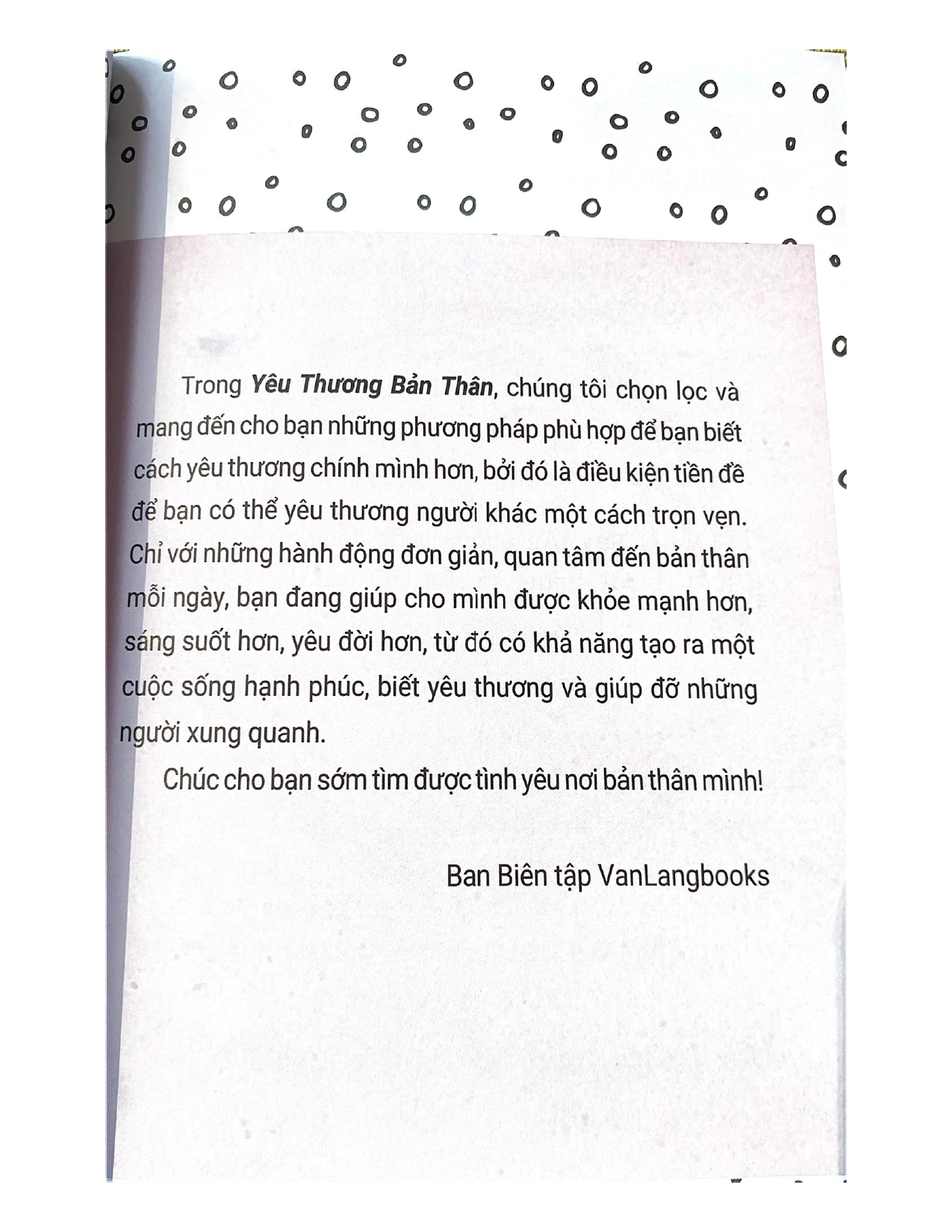 YÊU THƯƠNG BẢN THÂN mang đến cho bạn đọc những phương pháp phù hợp để biết cách yêu thương chính mình hơn, bởi đó là điều kiện tiền đề để bạn có thể yêu thương người khác một cách trọn vẹn.