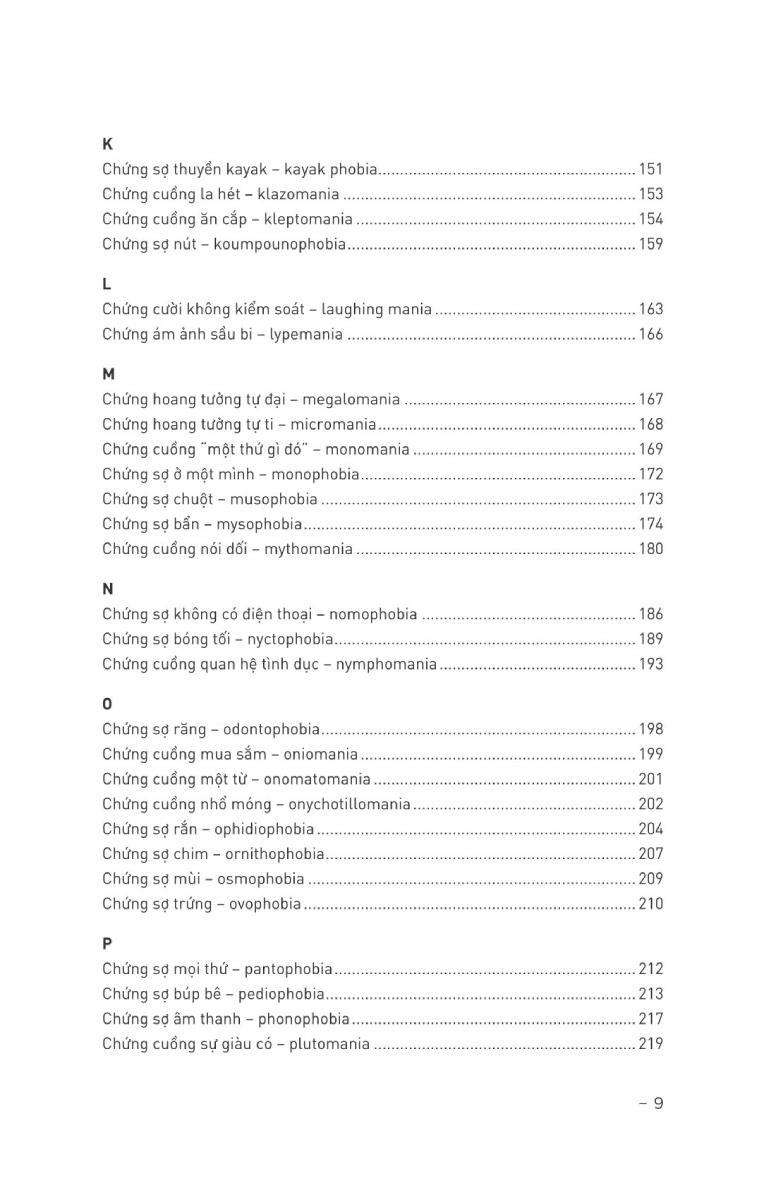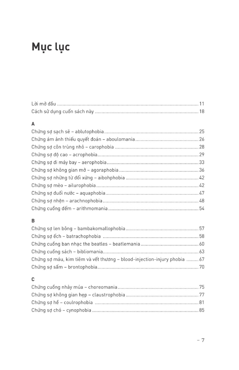 Cuốn sách bao gồm 99 nỗi ám ảnh sợ hãi (phobia) và cuồng loạn (mania) được sắp xếp theo thứ tự bảng chữ cái tên tiếng Anh từ Ablutophobia (chứng sợ sạch sẽ) đến Zoophobia (chứng sợ động vật), hoặc có thể chia thành các nhóm chủ đề như: cơ thể; tiếng ồn; bị cô lập; chạm vào…