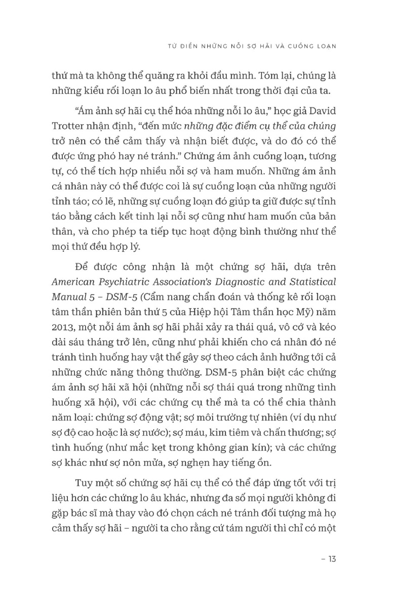 Hầu hết các nội dung trong sách này mô tả những tình trạng có thực và đôi khi còn khiến ta khổ sở. Các chứng ám ảnh sợ hãi và cuồng loạn còn tiết lộ nội tâm của ta – những thứ khiến ta giật bắn mình hay ngả nghiêng, những thứ mà ta không thể “quăng ra khỏi đầu mình”. Nếu ám ảnh sợ hãi là sự thôi thúc phải né tránh gì đó, thì cuồng loạn lại là sự thôi thúc chúng ta phải làm gì đó. Tóm lại, chúng là những kiểu rối loạn lo âu phổ biến nhất trong thời đại của ta.