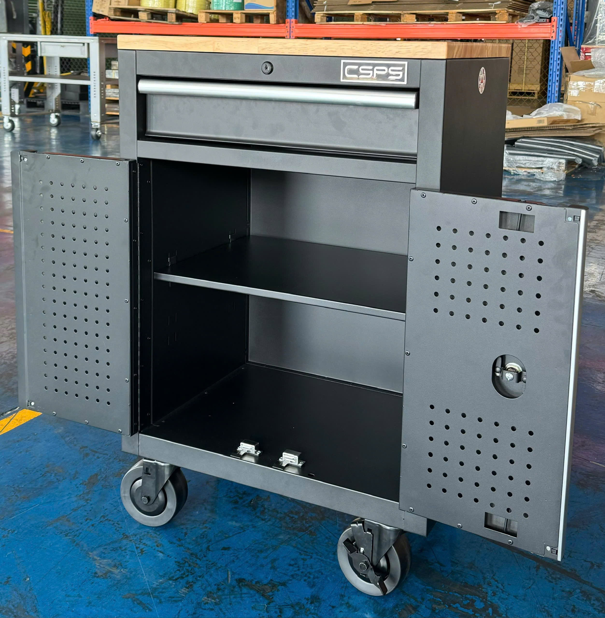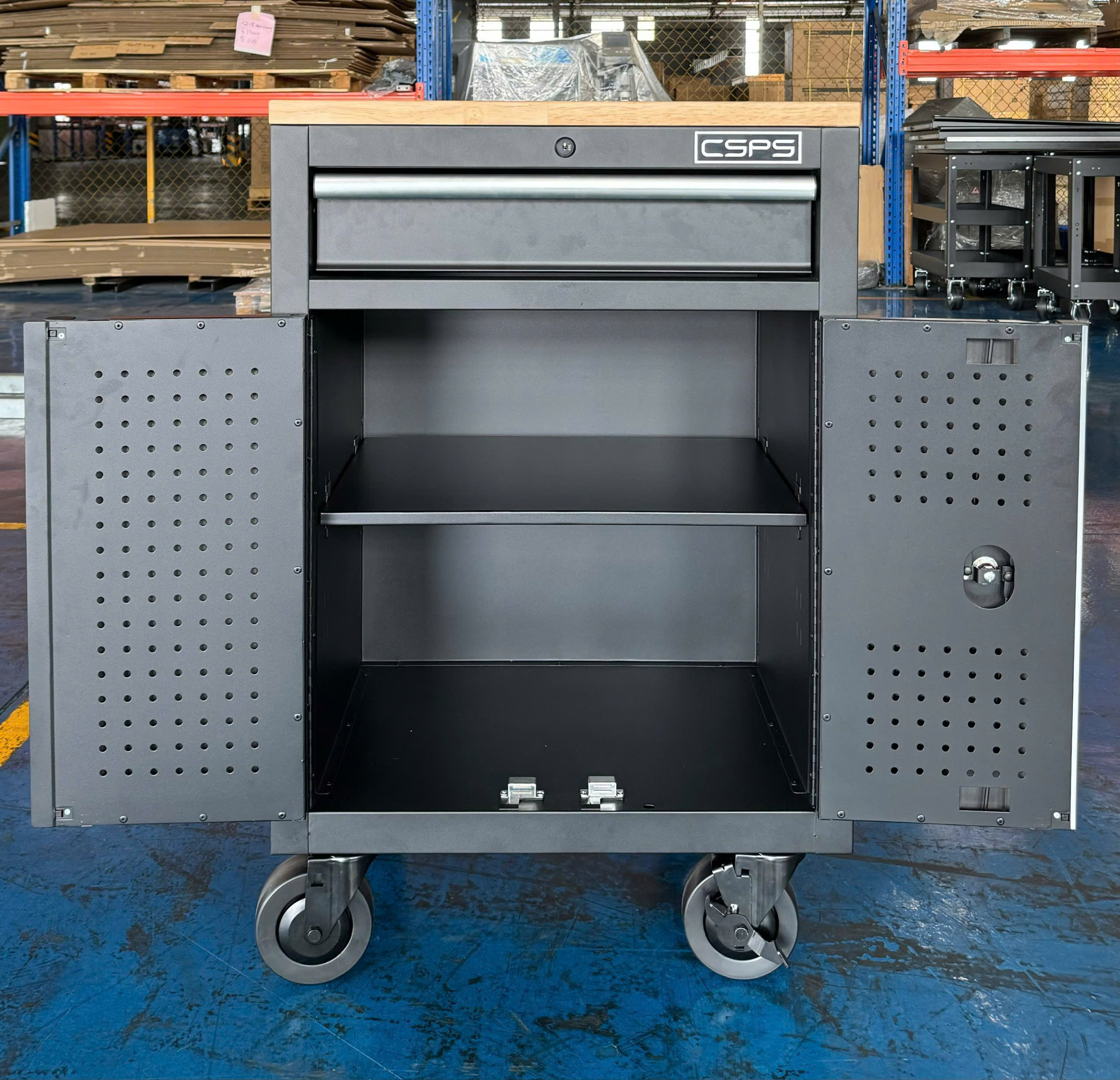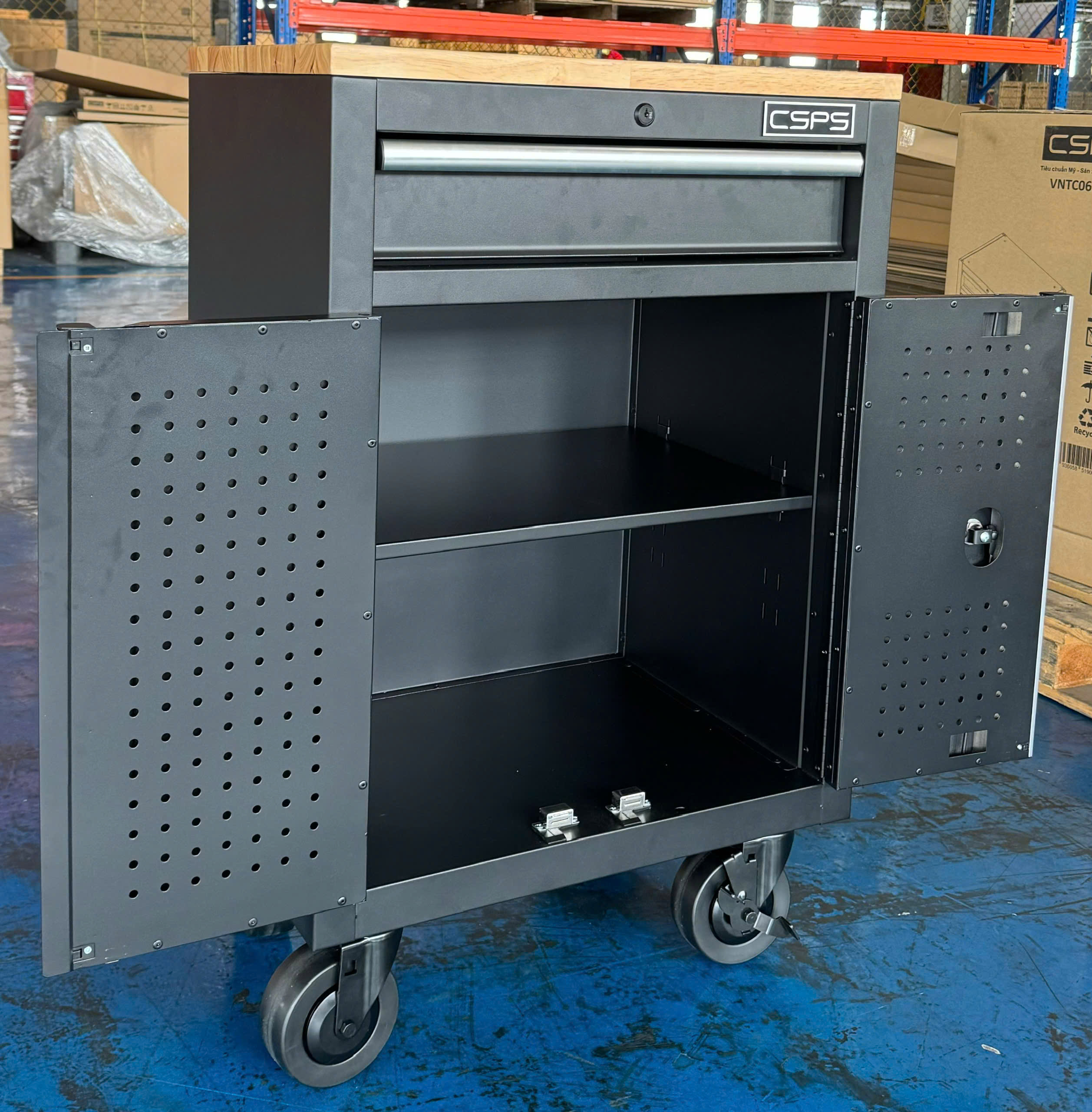 Tủ dụng cụ CSPS 61cm - 01 hộc kéo màu đen bánh xe ván gỗ (tay cầm trắng)