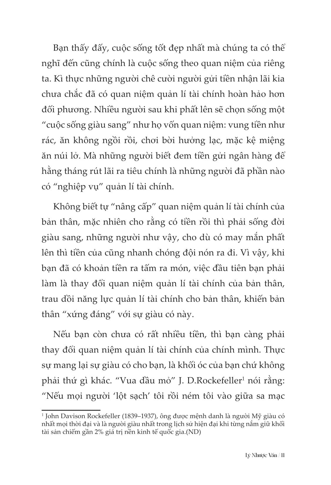 Warren Buffett đã từng nói: “Không có cái ví nào nghèo, chỉ có những cái đầu nghèo”. Sự khác biệt giữa người nghèo và người giàu không phải ở số lượng của cải mà là sự khác biệt ở tư duy tài chính và phương thức kiếm tiền. Nếu bạn thực sự muốn trở nên giàu có thì bạn nhất định phải vừa học cách làm ra tiền, vừa học cách quản lí và sử dụng đồng tiền.