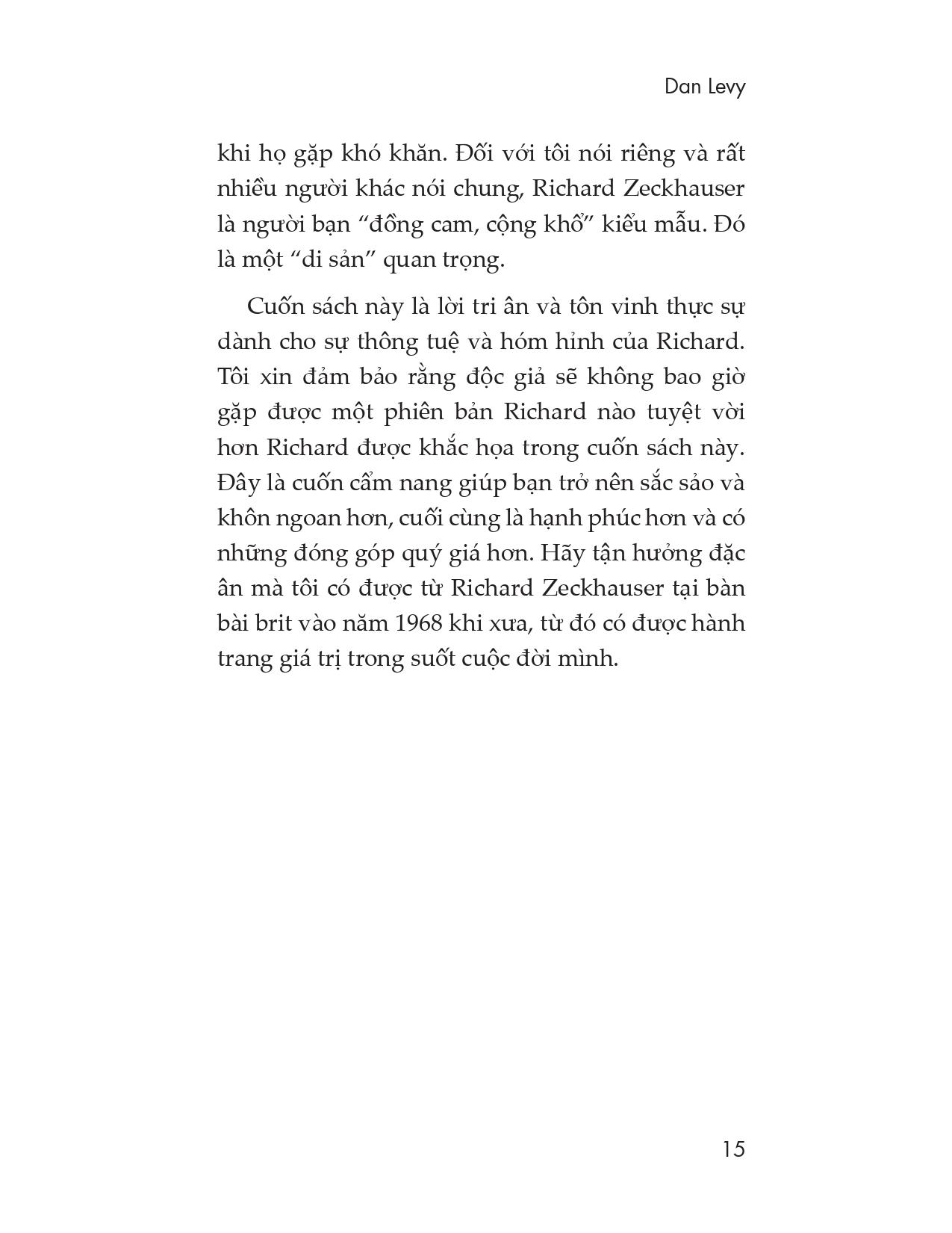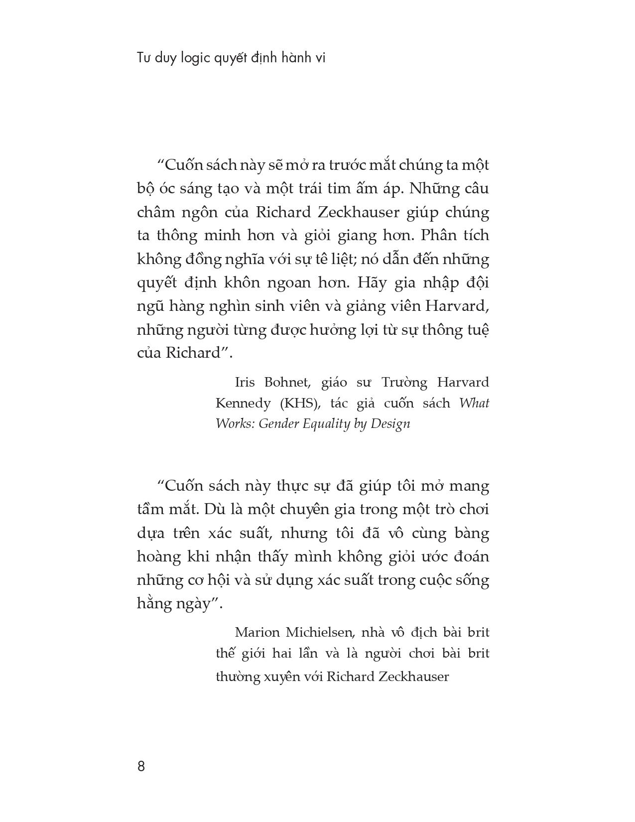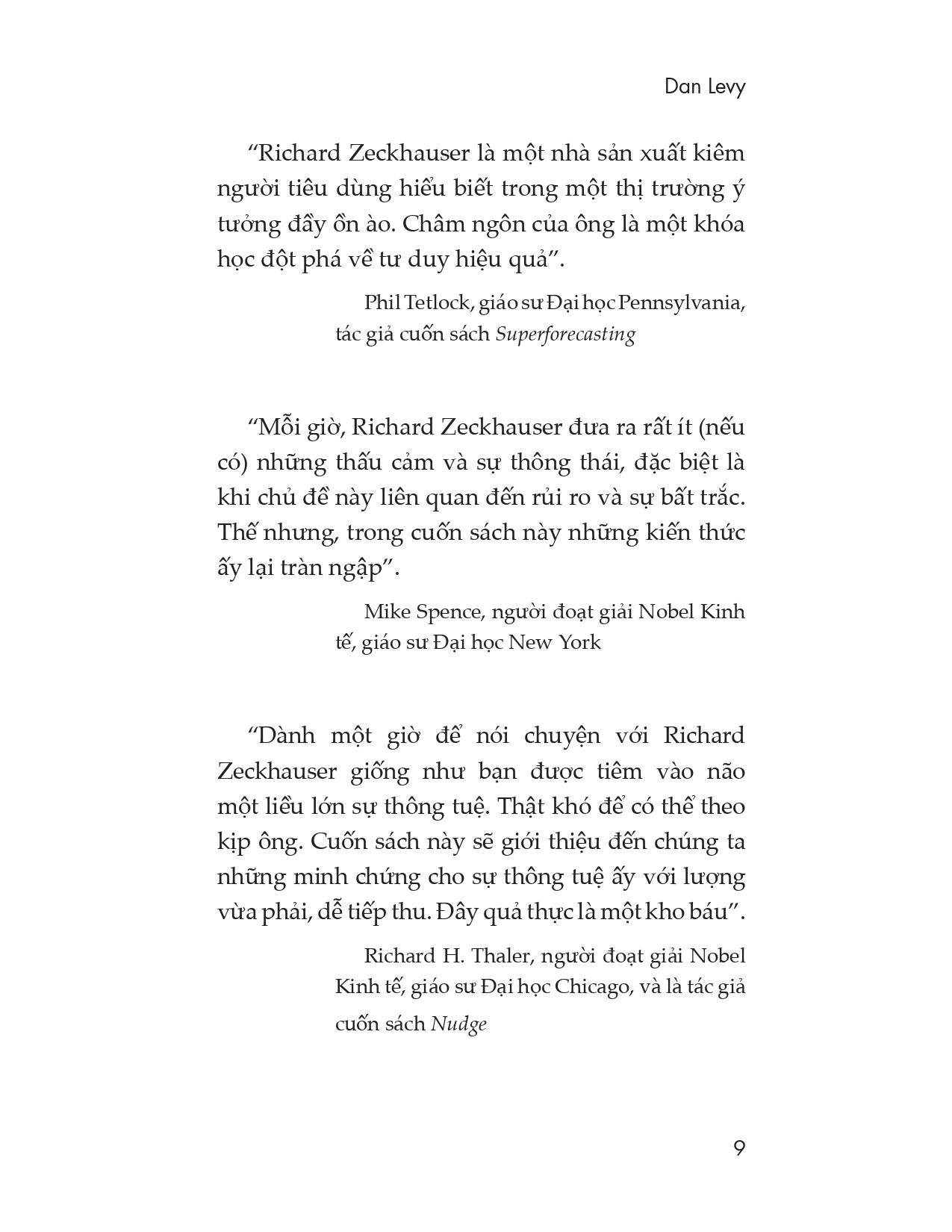 - Các nhận xét hay về cuốn sách: “Cuốn sách này sẽ mở ra trước mắt chúng ta một bộ óc sáng tạo và một trái tim ấm áp. Những câu châm ngôn của Richard Zeckhauser giúp chúng ta thông minh hơn và giỏi giang hơn. Phân tích không đồng nghĩa với sự tê liệt; mà dẫn đến những quyết định khôn ngoan hơn. Hãy gia nhập đội ngũ hàng nghìn sinh viên và giảng viên Harvard, những người từng được hưởng lợi từ sự thông tuệ của Richard”. Iris Bohnet, Giáo sư Trường Harvard Kennedy (KHS), tác giả của cuốn What Works: Gender Equality by Design “Richard Zeckhauser là một nhà sản xuất kiêm người tiêu dùng hiểu biết trong một thị trường ý tưởng đầy ồn ào. Châm ngôn của ông là một khóa học đột phá về tư duy hiệu quả”. Phil Tetlock, giáo sư Đại học Pennsylvania, tác giả của cuốn Superforecasting “Mỗi giờ, Richard Zeckhauser đưa ra rất ít (nếu có) những thấu cảm và sự thông thái, đặc biệt là khi chủ đề này liên quan đến rủi ro và sự bất trắc. Thế nhưng, trong cuốn sách này những kiến thức ấy lại tràn ngập”. Mike Spence, Người đoạt giải Nobel Kinh tế, giáo sư Đại học New York “Cuốn sách này thực sự đã giúp tôi mở mang tầm mắt. Dù là một chuyên gia trong một trò chơi dựa trên xác suất, nhưng tôi đã vô cùng bàng hoàng khi nhận thấy mình không giỏi ước đoán những cơ hội và sử dụng xác suất trong cuộc sống hằng ngày”. Marion Michielsen, nhà vô địch bài brit thế giới hai lần và là người chơi bài brit thường xuyên với Richard Zeckhauser “Dành một giờ để nói chuyện với Richard Zeckhauser giống như bạn được tiêm vào não một liều lớn sự thông tuệ. Thật khó để có thể theo kịp ông. Cuốn sách này sẽ giới thiệu đến chúng ta những minh chứng cho sự thông tuệ ấy với lượng vừa phải, dễ tiếp thu. Đây quả thực là một kho báu”. Richard H. Thaler, Người đoạt giải Nobel Kinh tế, giáo sư Đại học Chicago, và là tác giả của cuốn Nudge