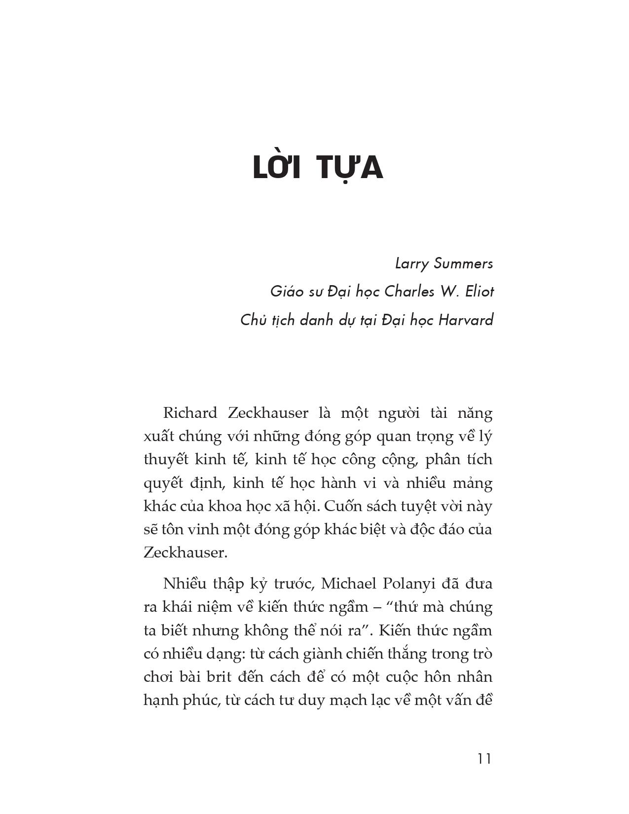 - Về Richard Zeckhauser: Richard Zeckhauser là một nhà kinh tế học người Mỹ và là Giáo sư Kinh tế Chính trị Frank P. Ramsey tại Trường Chính phủ Kennedy thuộc Đại học Harvard. Ông là một người tài năng xuất chúng với những đóng góp quan trọng về lý thuyết kinh tế, kinh tế học công cộng, phân tích quyết định, kinh tế học hành vi và nhiều mảng khác của khoa học xã hội.