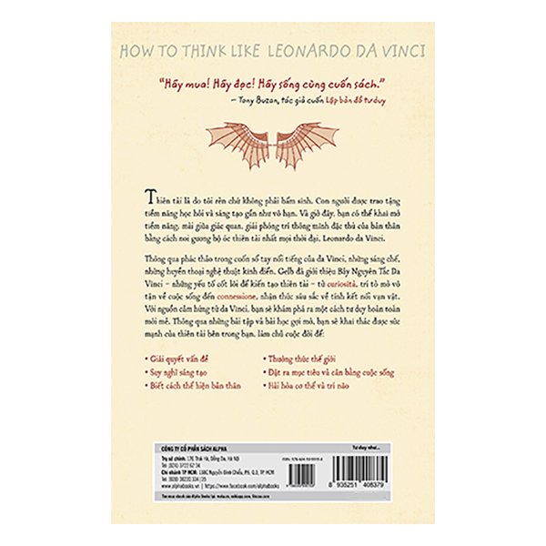 Tư duy như Leonardo da Vinci là cuốn sách kỹ năng giúp bạn có thể khám phá khả năng tiềm ẩn của mình, mài sắc nó và giải phóng trí thông minh bằng cách thực hiện theo những cách mà thiên tài lớn nhất mọi thời đại Leonardo da Vinci đã làm.