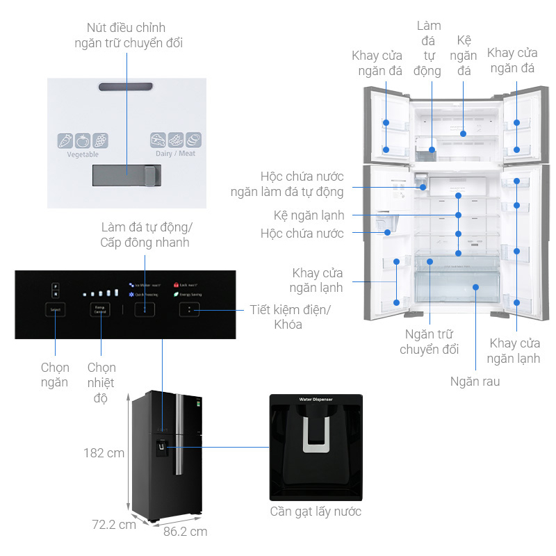 - Lấy nước bên ngoài: Trang bị hộc chứa nước bên trong và vòi lấy nước tích hợp bên ngoài cửa tủ, chỉ cần nhấn cần gạt rót nước trực tiếp mà không cần mở cửa tủ, hạn chế thất thoát nhiệt, tiết kiệm điện.