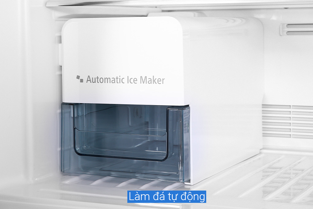 - Khay làm đá tự động: Nước được bơm từ hộc chứa ở ngăn lạnh liên tục lên khay chứa ở ngăn đông để tạo những viên đá nhỏ, đá tinh khiết sẽ tự rơi xuống khay chứa, luôn sẵn đá lạnh để sử dụng.