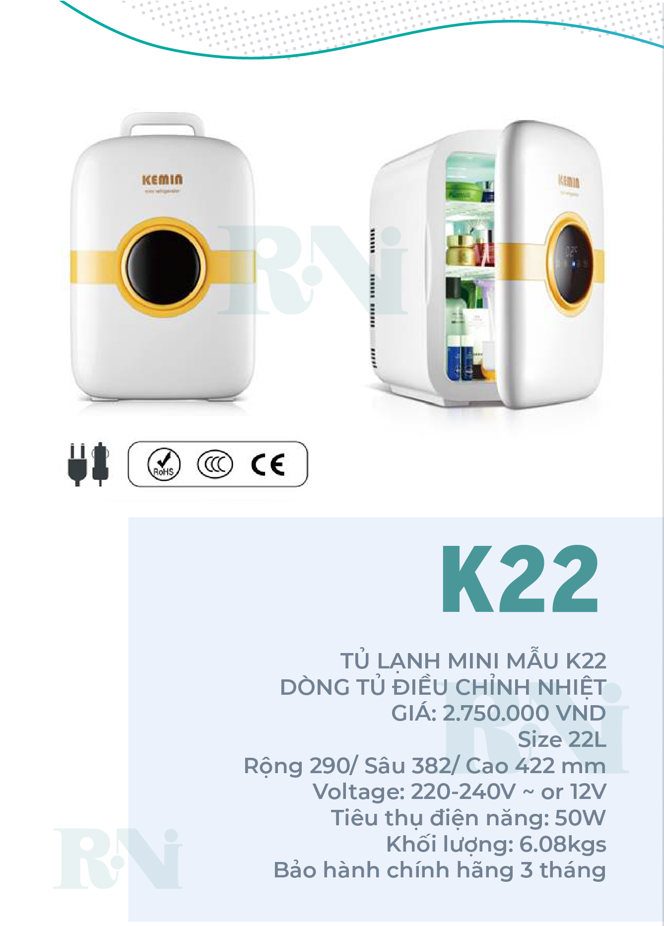- Tủ có 2 ổ cắm, 2 dây cắm cho điện 12V của ô tô và điện 220v sử dụng sinh hoạt gia đình. Thương hiệu: Kemin HongKong Tủ lạnh mini kemin có đủ các size 6L/10L/16L/22L/25L