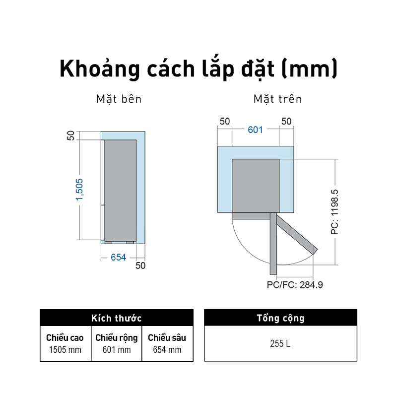 THÔNG SỐ KỸ THUẬT Thể tích thực (TCVN 7828:2016) Tổng cộng 540 L Ngăn lạnh (PC) 293 L Ngăn đông (FC) 186 L (bao gồm Prime Fresh 61L) Ngăn rau quả (VC) - Kích thước
