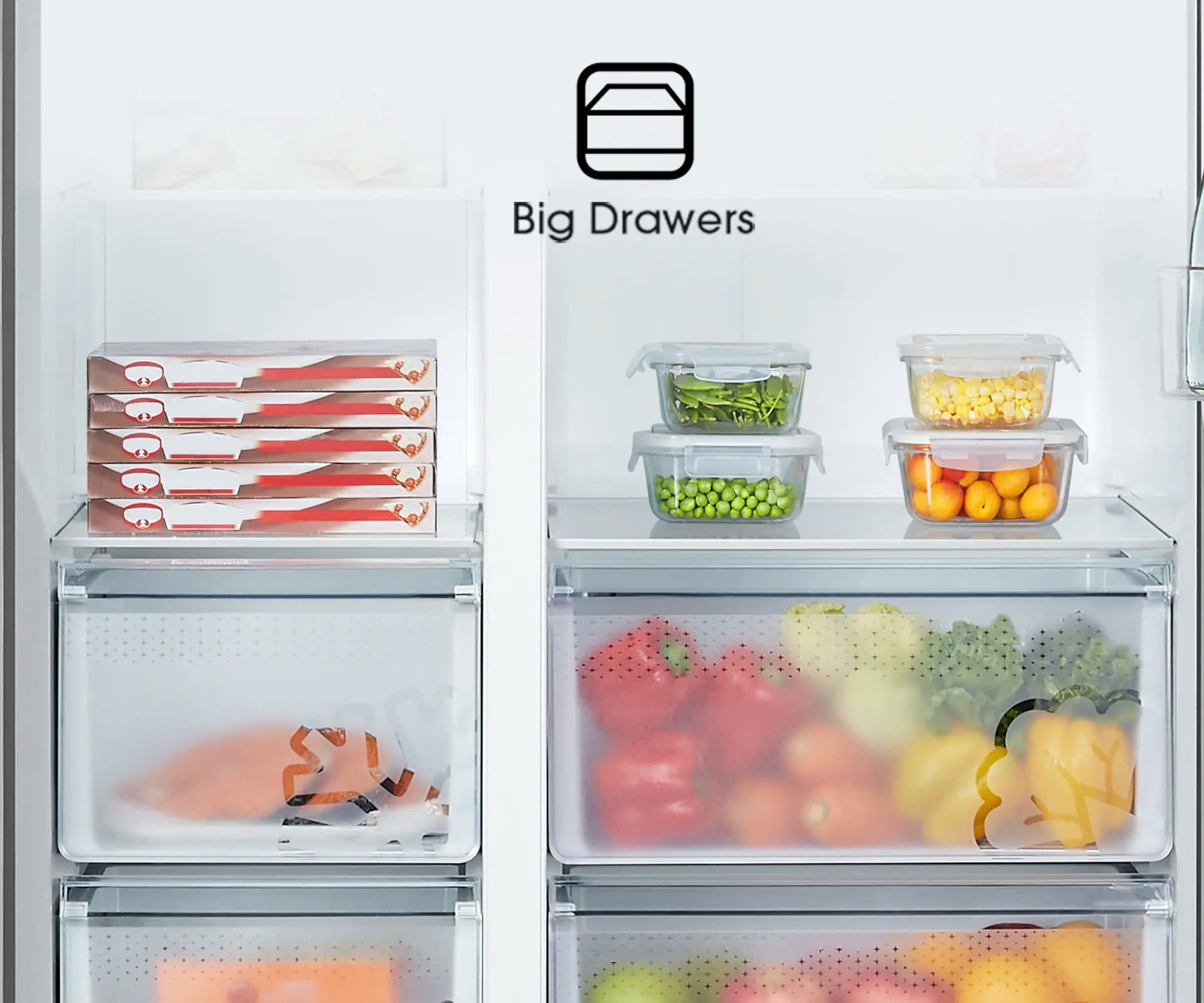 - Thiết kế ngăn kéo có chiều rộng tối đa, không chỉ đáp ứng nhu cầu về dung tích lưu trữ mà còn giúp bạn có thể sắp xếp gọn gàng. Ngăn kéo trong suốt giúp bạn rút ngắn thời gian tìm kiếm thực phẩm với số lượng lớn.