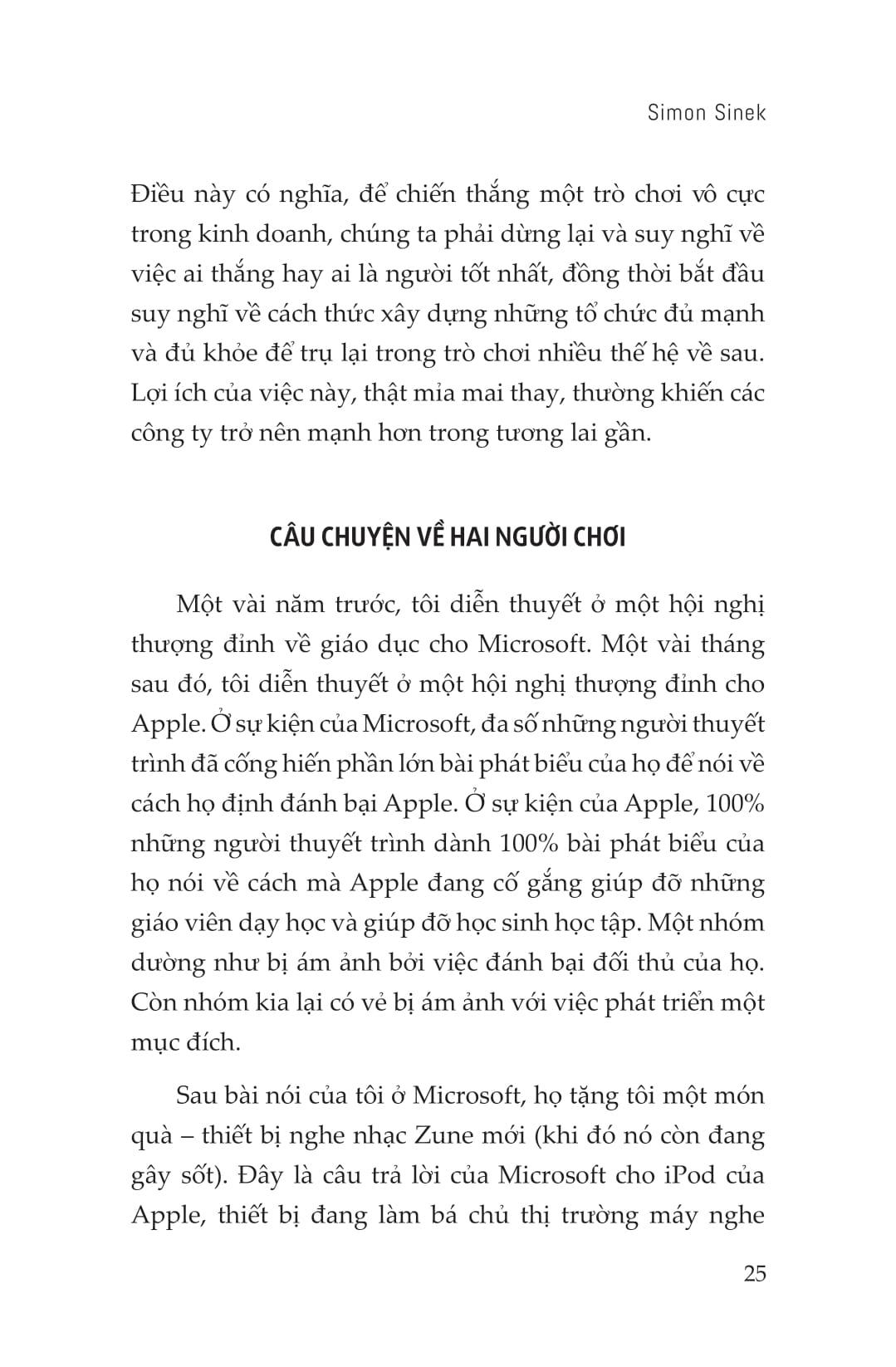 Từ Mục Tiêu Ngắn Hạn Đến Mục Đích Dài Hạn Trong bối cảnh kinh doanh hiện đại, doanh nghiệp đang phải đối mặt với những thách thức chưa từng có, buộc họ phải thay đổi tư duy cạnh tranh để thích ứng và tăng trưởng. Kinh doanh không phải là cuộc đua sẽ kết thúc khi có người về đích, cũng không phải là trò chơi sẽ đi đến hồi kết nếu có người chiến thắng. Những mục tiêu ngắn hạn về doanh số bán hàng hay tăng trưởng lợi nhuận không định nghĩa và đảm bảo vị thế bền vững của một doanh nghiệp. Mục đích không phải là chiến thắng ở mọi mặt trận mà là làm chủ và giữ vững cuộc chơi theo quy tắc ta đặt ra. Đối với một công ty, vị thế dẫn đầu có thể dựa trên số lượng khách hàng mà họ phục vụ. Đối với một công ty khác, đó là có thể quy mô doanh thu, giá cổ phiếu, số lượng nhân viên, số lượng chi nhánh hay văn phòng đang hoạt động trên khắp thế giới. Các công ty cũng là người quyết định khung thời gian họ thực hiện tính toán sổ sách. Đó có thể một quý. Hay 8 tháng. Đôi khi là một năm. Hay năm năm. Hay 12 năm. Thế nhưng, có phải tất cả mọi người trong ngành đều tuân thủ những khung thời gian này. Trong cuộc chơi kinh doanh vô cực, không có một khung tiêu chuẩn duy nhất tách biệt người chiến thắng với kẻ thua cuộc, những thứ như mục tiêu đạt được, tốc độ hay sức mạnh không quyết định tất cả. Trong bối cảnh hiện tại, có nhiều vô số biến số, yếu tố ngăn cản để bạn không bao giờ chiến thắng. Cạnh tranh không bao giờ dừng lại trong kinh doanh. Đối thủ tham gia thị trường rồi biến mất khỏi cuộc chơi khi họ cạn kiệt nguồn lực và ý chí. Và sự “thất bại” này chúng ta gọi đó là phá sản, đôi khi là bị thâu tóm hoặc mua lại. Vậy nên, thay vì bận tâm ai chiến thắng hay ai là người tốt nhất, hãy nghĩ cách làm thế nào để phát triển và củng cố tổ chức với sức mạnh và tiềm lực đủ lớn cho sự tăng trưởng bền vững. Và tư duy vô hạn này cũng giúp công ty phát triển mạnh mẽ hơn trong ngắn hạn. Những lãnh đạo có tư duy vô hạn tin rằng việc không thể linh hoạt sẽ giới hạn đáng kể khả năng phát triển mục đích của doanh nghiệp và tiếp tục con đường đó sẽ dẫn đến sự sụp đổ tất yếu. Đã đến lúc lãnh đạo doanh nghiệp phải thay đổi nền tảng và trọng tâm chiến lược. Cuốn sách “Từ mục tiêu ngắn hạn đến mục đích dài hạn” sẽ hướng dẫn bạn cách đúng đắn để chơi trò chơi kinh doanh vô cực này. Qua đó tác giả Simon Sinek đã đưa ra một chiến lược để dẫn đầu với tư duy vô hạn. Những nhà lãnh đạo với lối suy nghĩ vô hạn, sẵn sàng thách thức hiện trạng và thay thế nó với một thực tế mới sẽ có khả năng khiến cho bản ngã con người cố hữu của tất cả chúng ta cảm thấy an toàn hơn, sẵn sàng cống hiến cho một điều gì đó lớn lao hơn chính bản thân và cung dưỡng cho chúng ta cũng như gia đình, để từ đó xây dựng các tổ chức mạnh mẽ hơn và sáng tạo hơn trên toàn thế giới.