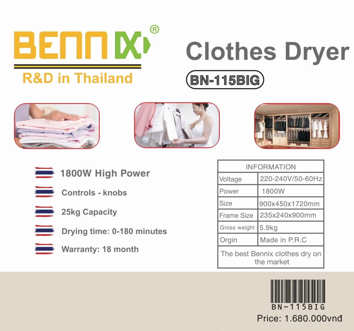Tủ Sấy Quần Áo Bennix BN-115BIG -1800W Vài năm gần đây tủ sấy quần áo Thái Lan thương hiệu Bennix được nhiều gia đình lựa chọn. Sản phẩm có khung chắc chắn, vải bạt tốt, động cơ sấy an toàn, vải bạt bên ngoài không bị vỡ giòn hay rách mủn sau một thời gian sử dụng như loại rẻ tiền đang bán trên thị trường. Mặc dù giá cao hơn một chút so với máy sấy quần áo giá rẻ nhưng lợi ích mang lại lâu dài và yên tâm sử dụng. Khung Inox to Điểm khác biệt lớn nhất của tủ sấy quần áo Thái Lan Bennix BN-115BIG mẫu mới là khung inox cao hơn. Chiều cao sau lắp đặt khoảng 172cm, trong khi các loại đang bán trên thị trường khoảng 150cm. Chiều rộng của tủ 90cm (loại cũ chỉ 70cm). Nhờ đó bạn treo được nhiều đồ hơn. Với các mẫu máy sấy quần áo hiện nay thường sấy khoảng 15kg nhưng Bennix BN-115BIG có thể sấy tối đa 25kg. Các thanh inox cũng to hơn, khi lắp đặt bạn sẽ có cảm giác chắc chắn hơn rất nhiều so với các loại. Khả năng chịu lực tốt. Chất liệu inox không gỉ. Ngoài các thanh chính còn có thêm các thanh phụ nhỏ giúp tăng khả năng tận dụng tối đa bên trong buồng sấy. Khả năng cơ động cao với bánh xe di chuyển. Thiết kế thông minh dễ dàng tháo lắp khi có nhu cầu hoặc không muốn sử dụng khi hết mua. Khung tủ chắc chắn bạn cũng có thể sử dụng thay cho tủ vải đựng quần áo. Vải cao cấp Vải bạt phủ bên ngoài thủ sấy cũng có sự khác biệt đáng kể. Thay vì sử dụng chất liệu pha nhiều, tủ sấy quần áo Bennix BN-115BIG sử dụng loại vải cao cấp. Nhờ đó độ bền tăng lên rấ nhiều. Sản phẩm không bị mục, rách, thoái hóa sau một thời gian sử dụng. Công suất lớn Động cơ của tủ sấy quần áo Bennix BN-115BIG cũng có sự khác biệt rất lớn. Công suất lớn, chất liệu nhự cao cấp và bộ phát nhiệt ổn định giúp duy trì nhiệt độ bên trong buồng sấy tối ưu. Máy sẽ tự động ngắt sau khi hết thời gian để đảm bảo an toàn. Sấy khô nhanh, bảo vệ quần áo Công suất của động cơ tối đa 1800w, nhờ đó máy có thể sấy lượng lớn quần áo nhanh chóng. Thời gian sấy có thể lựa chọn tối đa 3 giờ. Tùy theo lượng quần áo, chấ liệu vải dầy hay mọng bạn có thể chọn lựa thời gian phù hợp. Hệ thống sấy khô kết hợp diệt sạch vi khuẩn và chống nhăn giúp bảo vệ quần áo. Hướng dẫn sử dụng tủ sấy Bennix BN-115BIG Trước tiên bạn cần lắp ráp tủ sấy trước khi sử dụng. Tham khảo qua sách hướng dẫn lắp đặt