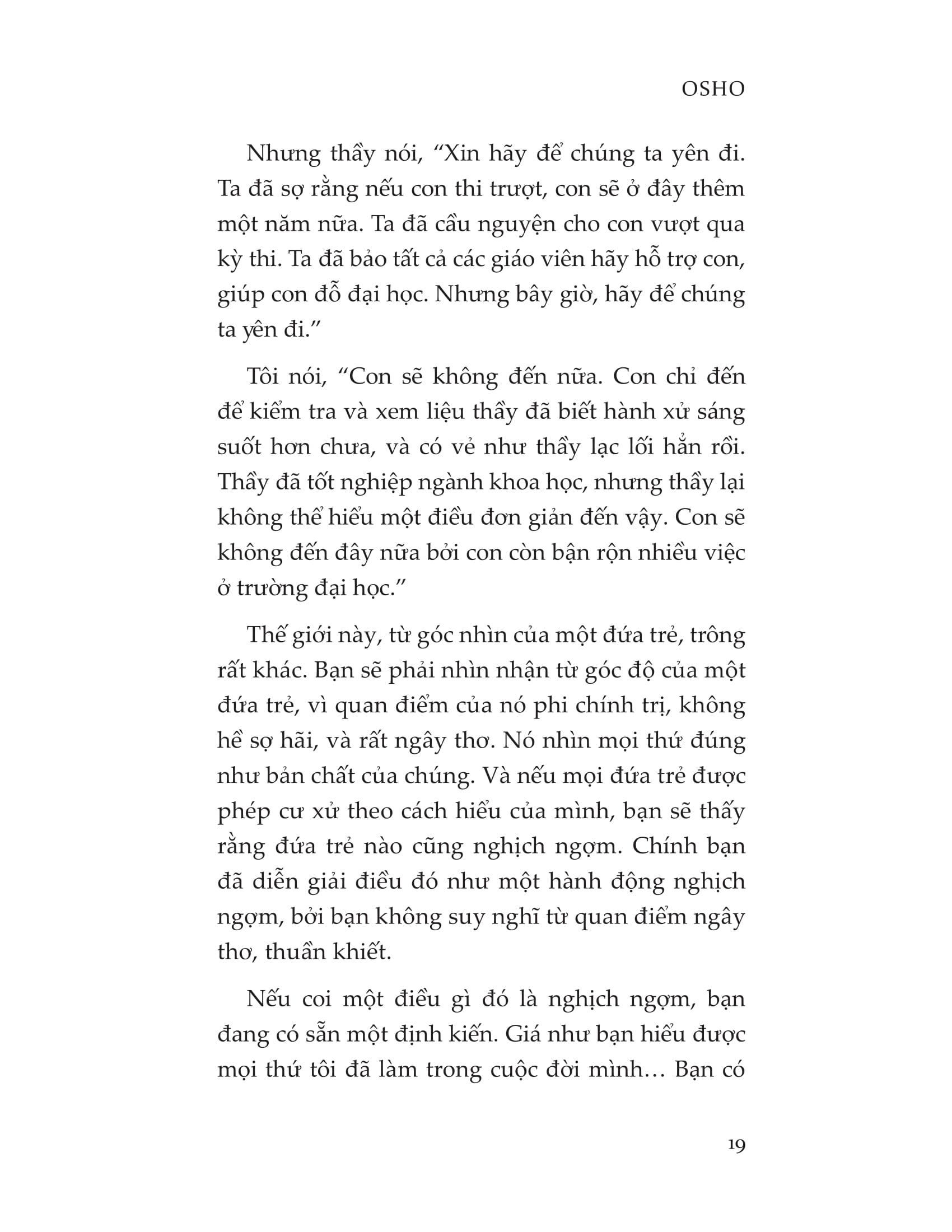 Trong cuốn sách này, Osho giúp chúng ta định nghĩa lại con người mình. Đối với hầu hết mọi người, từ khi ta đủ lớn để biết đi, nhiều bài giảng tôn giáo và đạo đức đã được sử dụng để định hình hành vi của chúng ta - một con người nhỏ bé trong thế giới của rất nhiều con người khác. Osho nói rằng, nếu như chúng ta còn mang gánh nặng của những quan điểm và những điều mê tín dị đoan bị áp đặt lên bản thân này, thì ta thậm chí không thể bắt đầu một cuộc tìm kiếm trung thực để khám phá xem ta thực sự là ai. Một khi ta còn chưa biết mình là ai, sự tự tôn mà ta đang có hiện nay sẽ chỉ là một thứ được xây trên nền móng thiếu vững chắc, dễ dàng đổ sụp ngay vào khoảnh khắc một niềm tin nào đó mà chúng ta trân quý bị đặt dấu hỏi.