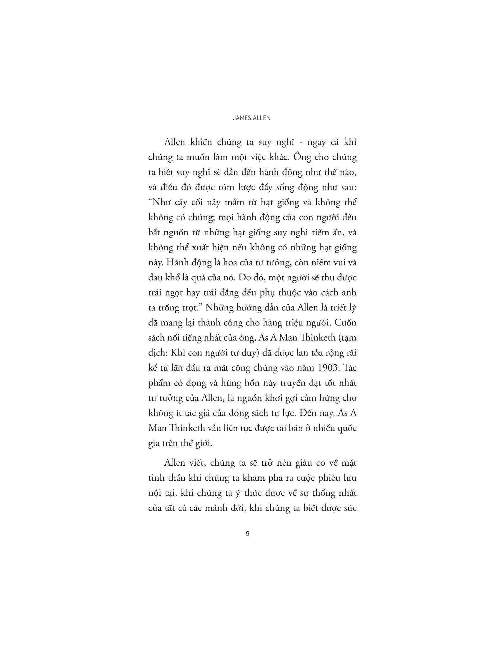 James Allen (1864 – 1912) là một người bí ẩn trong giới sách vở, nhưng những bài viết đầy cảm hứng của ông đã tác động đến hàng triệu người. Những chiêm nghiệm sâu sắc của ông về nội tâm con người - cụ thể là cách con người suy nghĩ, cảm nhận và tu dưỡng đạo đức - vẫn còn nguyên giá trị và thường xuyên được trích dẫn lại, ngay cả khi những cuốn sách ông viết đã được xuất bản cách đây hơn một trăm năm, trong những năm đầu tiên của thế kỷ 20.
