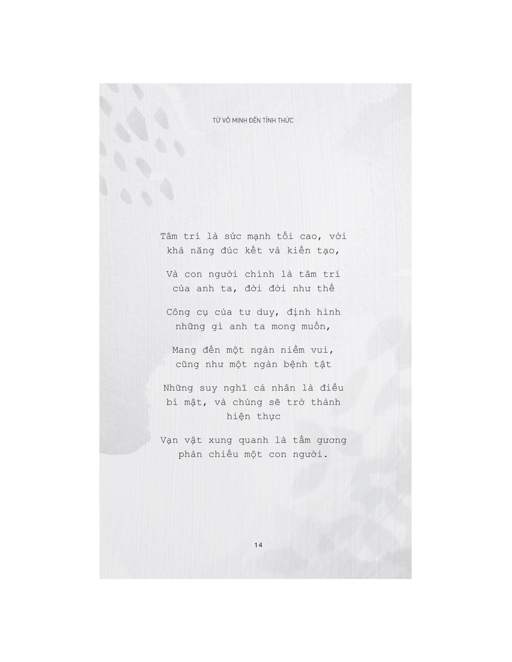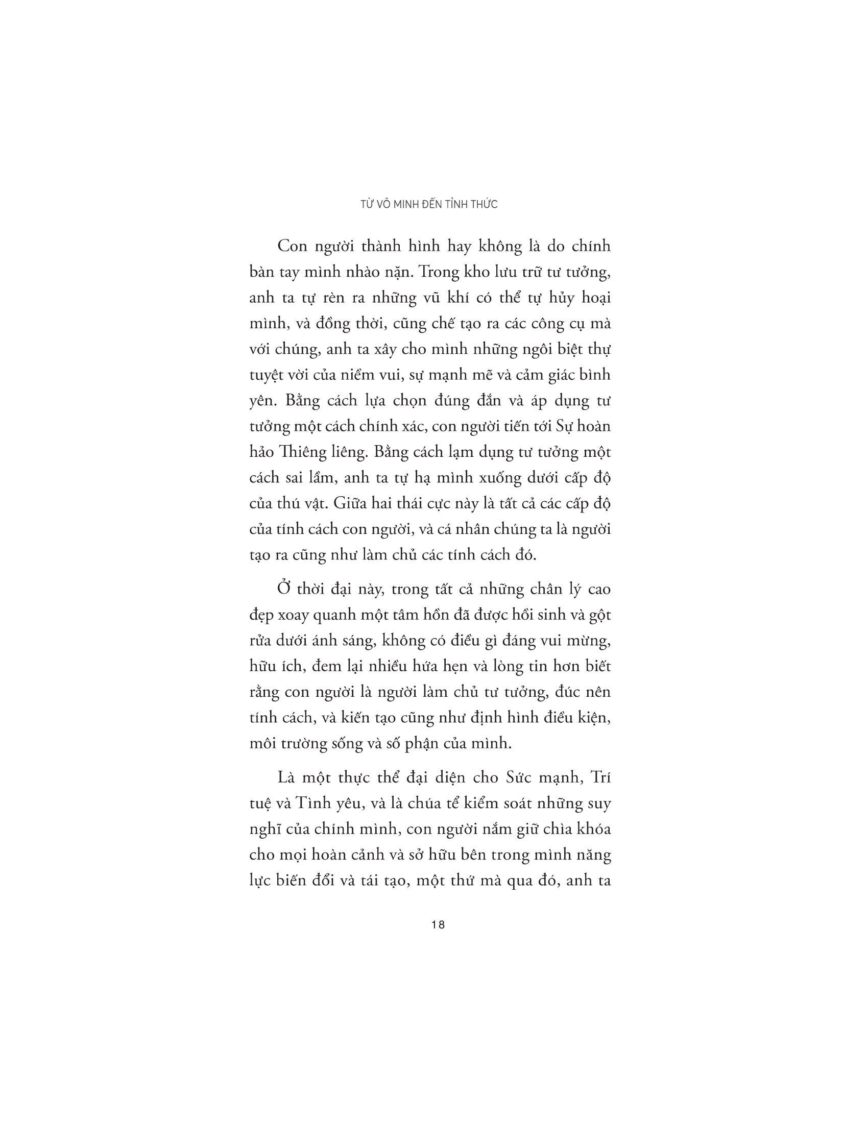 As a man thinketh – Từ vô minh đến tỉnh thức là tuyển tập những tác phẩm nổi tiếng nhất của triết gia thiên tài người Anh – James Allen. Cuốn sách này là những dòng suy ngẫm của tác giả về bản chất con người, với tư cách là một cá thể độc lập cũng như một thành viên của xã hội. Thế giới bên ngoài, rực rỡ, đẹp đẽ hay tăm tối xấu xa, hoàn toàn phụ thuộc vào cách ta nuôi dưỡng thế giới nội tâm của m.ình. Trong hành trình vun xới cho khu vườn tâm trí ấy, liệu ta có biếng lười mà thả m.ình theo những cám dỗ ngọt ngào hiểm ác, hay sẽ can đảm lựa chọn một con đường dẫu gian lao nhưng lương thiện, trong sáng và được ban phước lành?