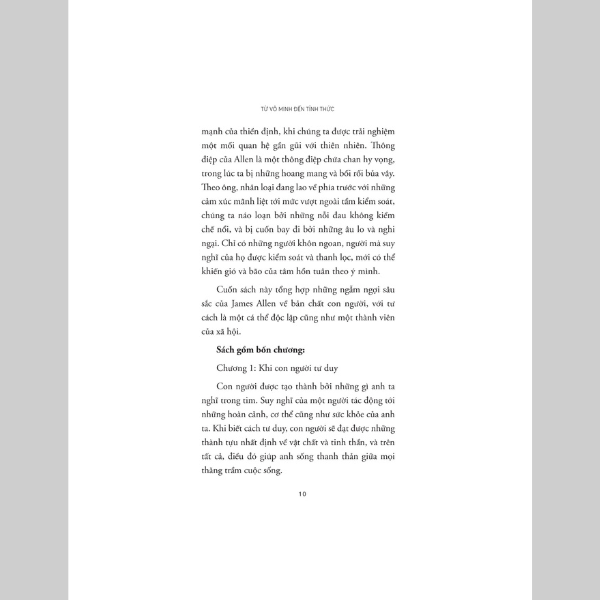 Mã hàng 8936066698719 Tên Nhà Cung Cấp 1980 Books Tác giả James Allen NXB Thanh Niên Năm XB 2024 Ngôn Ngữ Tiếng Việt Trọng lượng (gr) 300 Kích Thước Bao Bì 20.5 x 13 x 1.66 cm Số trang 332 Hình thức Bìa Mềm Từ Vô Minh Đến Tỉnh Thức “Mỗi hạt giống suy nghĩ được gieo vào tâm trí và bén rễ ở đó sẽ tự sinh trưởng và nở hoa thành hành động, rồi tạo nên những cơ hội và hoàn cảnh cụ thể. Ý nghĩ tốt lành đậu quả ngọt thơm, ý nghĩa xấu xa đậu quả mục rỗng”. As a man thinketh – Từ vô minh đến tỉnh thức là tuyển tập những tác phẩm nổi tiếng nhất của triết gia thiên tài người Anh – James Allen. Cuốn sách này là những dòng suy ngẫm của tác giả về bản chất con người, với tư cách là một cá thể độc lập cũng như một thành viên của xã hội. Thế giới bên ngoài, rực rỡ, đẹp đẽ hay tăm tối xấu xa, hoàn toàn phụ thuộc vào cách ta nuôi dưỡng thế giới nội tâm của mình. Trong hành trình vun xới cho khu vườn tâm trí ấy, liệu ta có biếng lười mà thả mình theo những cám dỗ ngọt ngào hiểm ác, hay sẽ can đảm lựa chọn một con đường dẫu gian lao nhưng lương thiện, trong sáng và được ban phước lành? Về tác giả: James Allen (1864 – 1912) là một người bí ẩn trong giới sách vở, nhưng những bài viết đầy cảm hứng của ông đã tác động đến hàng triệu người. Những chiêm nghiệm sâu sắc của ông về nội tâm con người - cụ thể là cách con người suy nghĩ, cảm nhận và tu dưỡng đạo đức - vẫn còn nguyên giá trị và thường xuyên được trích dẫn lại, ngay cả khi những cuốn sách ông viết đã được xuất bản cách đây hơn một trăm năm, trong những năm đầu tiên của thế kỷ 20. James Allen hướng tới sống một cuộc đời lý tưởng theo miêu tả của tiểu thuyết gia vĩ đại người Nga Lev Tolstoy, một cuộc sống tự nguyện nghèo khó, đề cao lao động chân tay và gìn giữ kỷ luật một cách khổ hạnh. Giống như Tolstoy, Allen tìm cách cải thiện bản thân mình, biết hạnh phúc và trở thành một con người toàn diện về đạo đức. Những tác phẩm của Allen một mặt thể hiện ảnh hưởng của chủ nghĩa Tin lành tự do và mặt khác thể hiện tư tưởng Phật giáo. Allen tập trung vào sức mạnh của mỗi cá nhân trong việc hình thành tính cách và tạo ra hạnh phúc cho chính mình. Ông nói, tư duy và tính cách là một, và vì tính cách chỉ có thể tự bộc lộ thông qua môi trường và hoàn cảnh, nên các điều kiện bên ngoài của cuộc sống một người sẽ luôn liên quan một cách hài hòa với nội tâm của họ. Những lời khen tặng “Đến ngày hôm nay, tác phẩm của James Allen về sức mạnh của tâm trí vẫn giá trị như khi nó được viết ra một thế kỷ trước.” “As a Man Thinketh là một cuốn sách cách mạng giúp mang tới nhận thức về sức mạnh của tiềm thức, thành tựu và những suy nghĩ tích cực”  “As a Man Thinketh là một cuốn sách ngắn nhưng có khả năng và sẽ thay đổi cuộc đời bạn.”