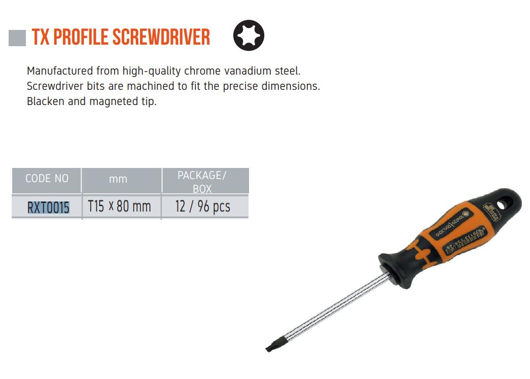 Tua vít đầu sao torx T15 Retta RXT0015 Model:RXT0015 Chiều dài:80mm Là dụng cụ cầm tay, chuyên dùng để vặn, siết đóng ốc vít bằng tay. Sản phẩm được gia công rất tỉ mỉ, đã qua
