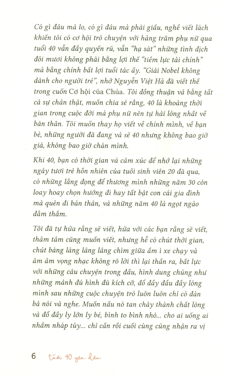 Và đây, không bắt buộc… mà tất cả chữ cứ tự chảy. Dường như cuộc sống của những phụ nữ sắp bước vào tuổi 40, đang 40 hay vừa qua tuổi 40 đểu rạng rỡ, nồng nàn và buộc chị phải viết về họ, để tự hào về họ và chính mình.