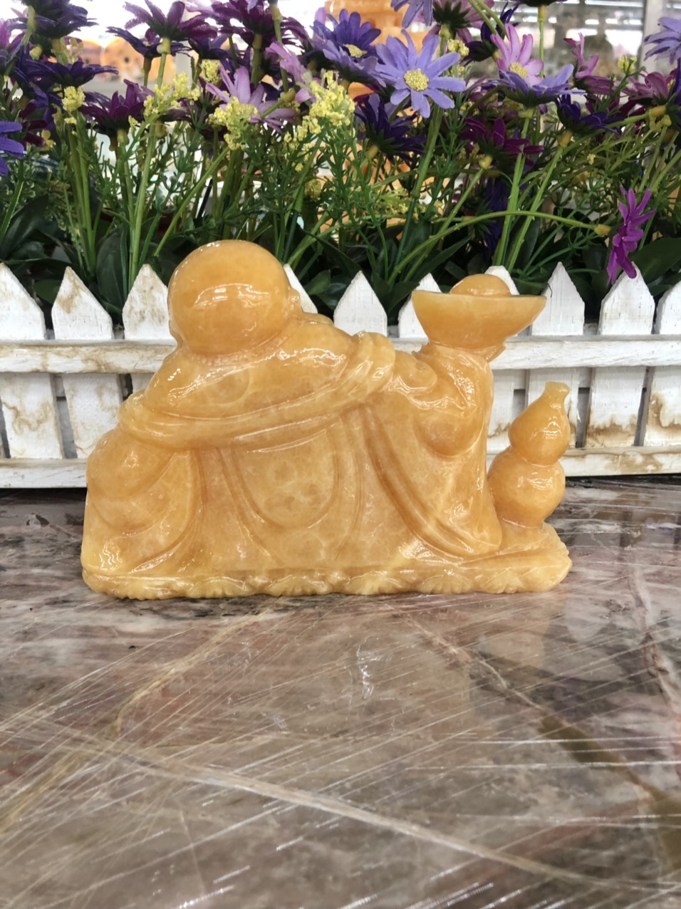 ✨Tượng Phật Di Lặc ngồi cầm thỏi vàng và hồ lô phong thủy đá ngọc hoàng long trang trí bàn làm việc - Dài 16 cm