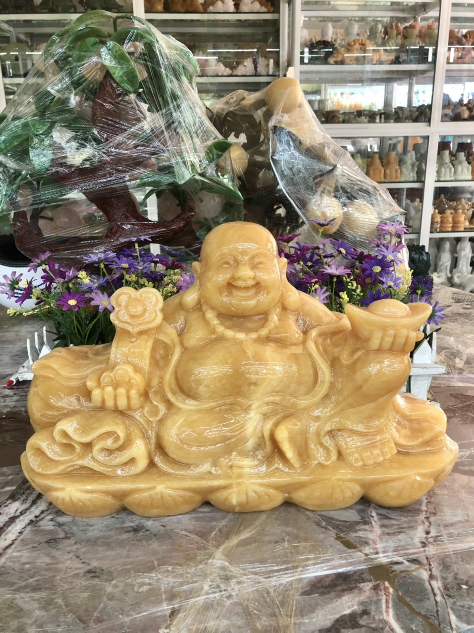 Tượng Phật Di Lạc cầm thỏi vàng khắc trên đá Ngọc Hoàng Long