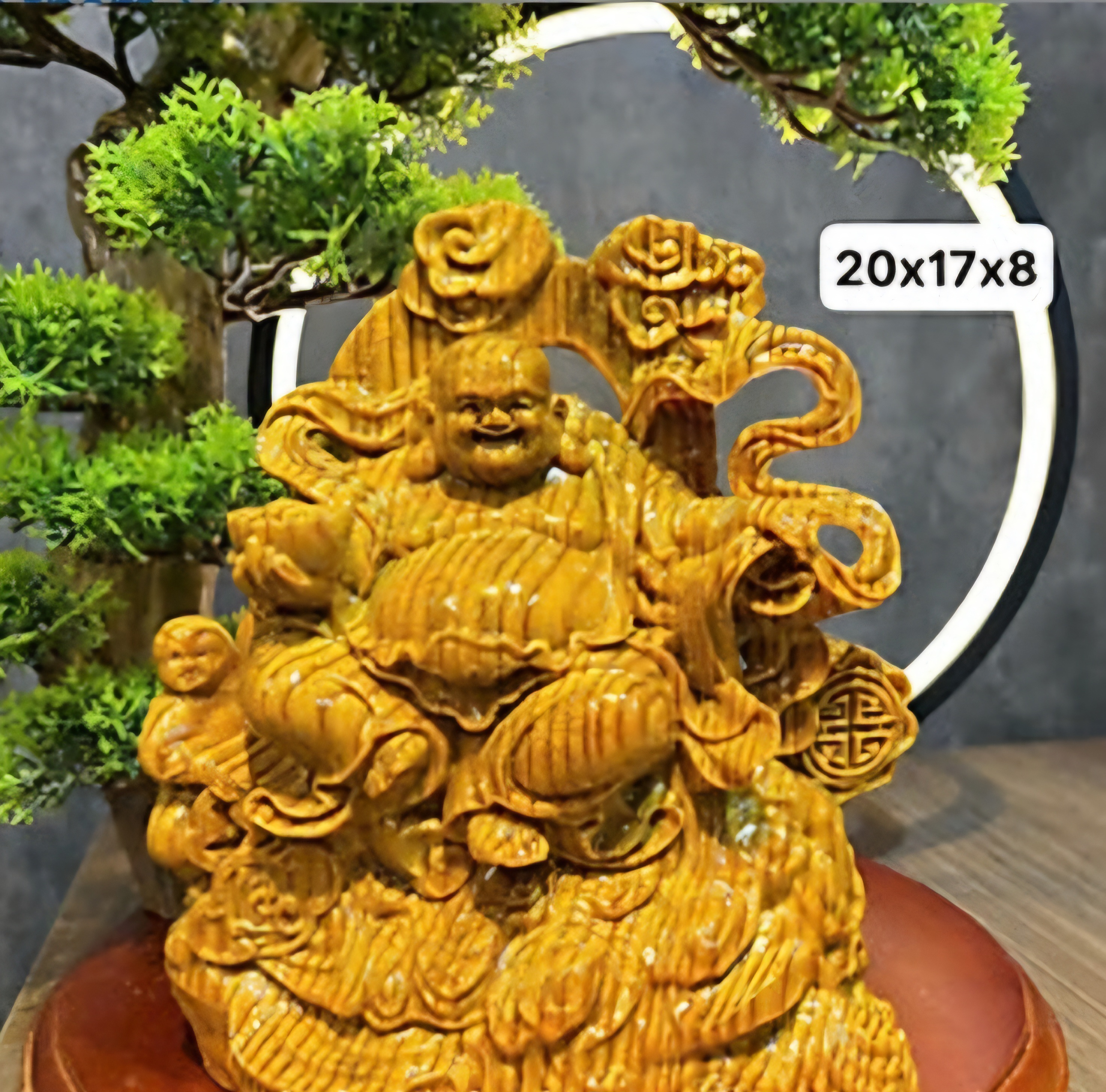 Chất liệu: Đá ngọc Hoàng Long Kích thước: Dài 50 cm x Rộng 20 cm x Cao 34 cm Khối lượng: 40 kg Phật Di Lặc trong Phong thủy Còn gọi là "Phật Cười", Di