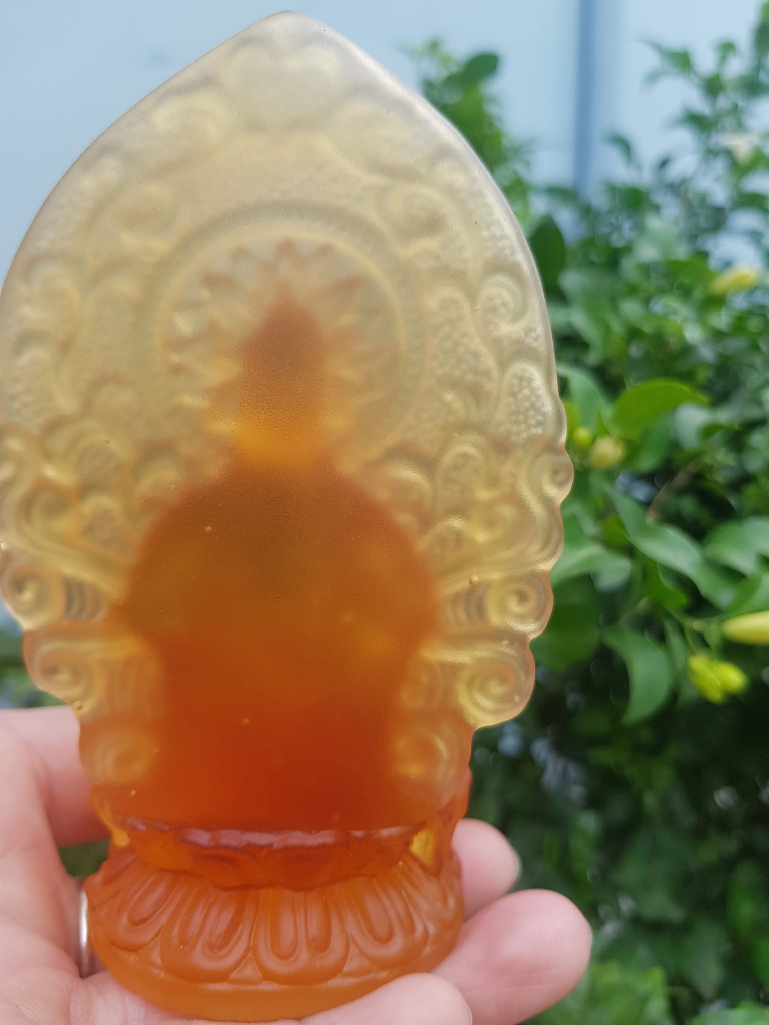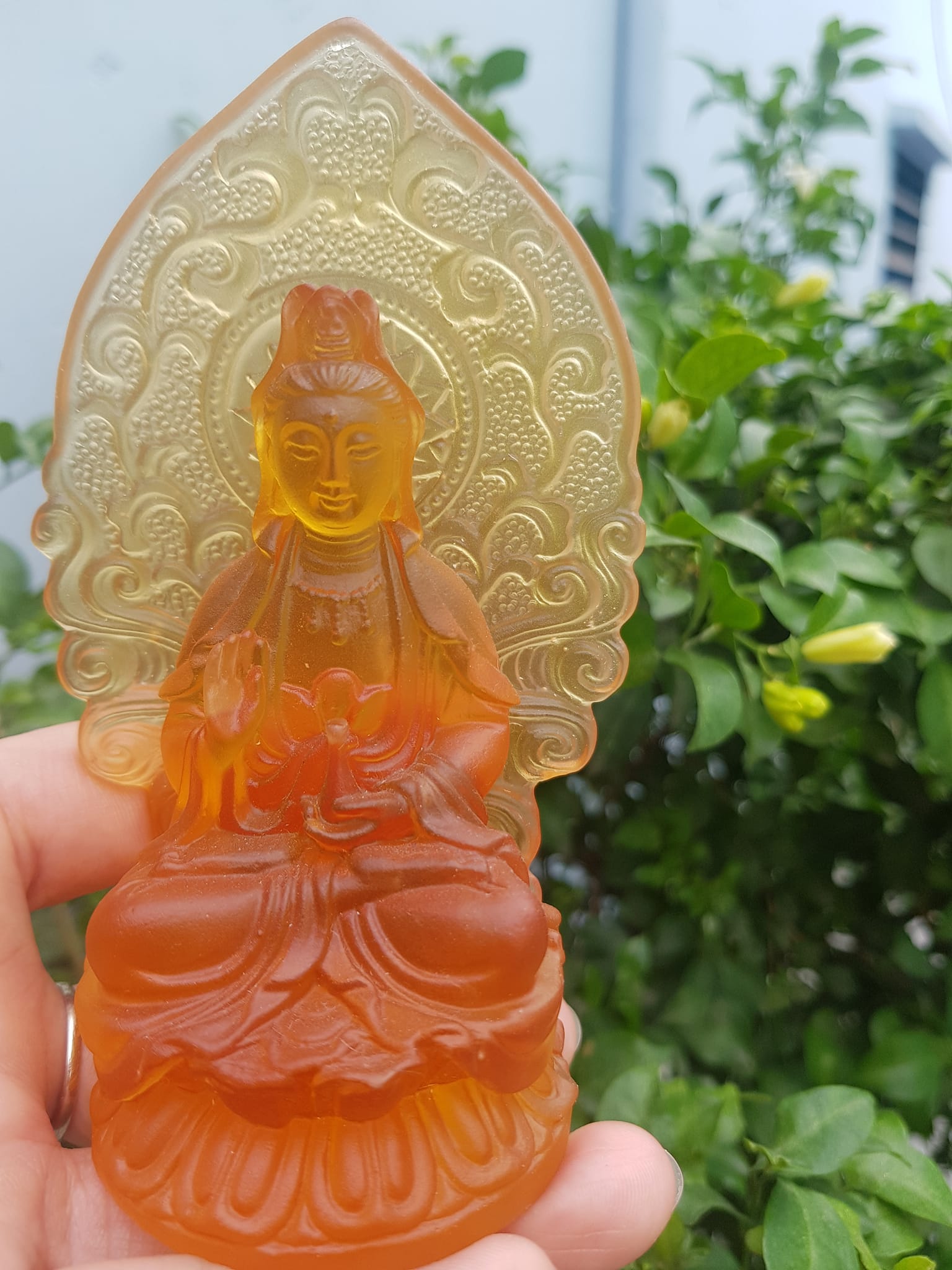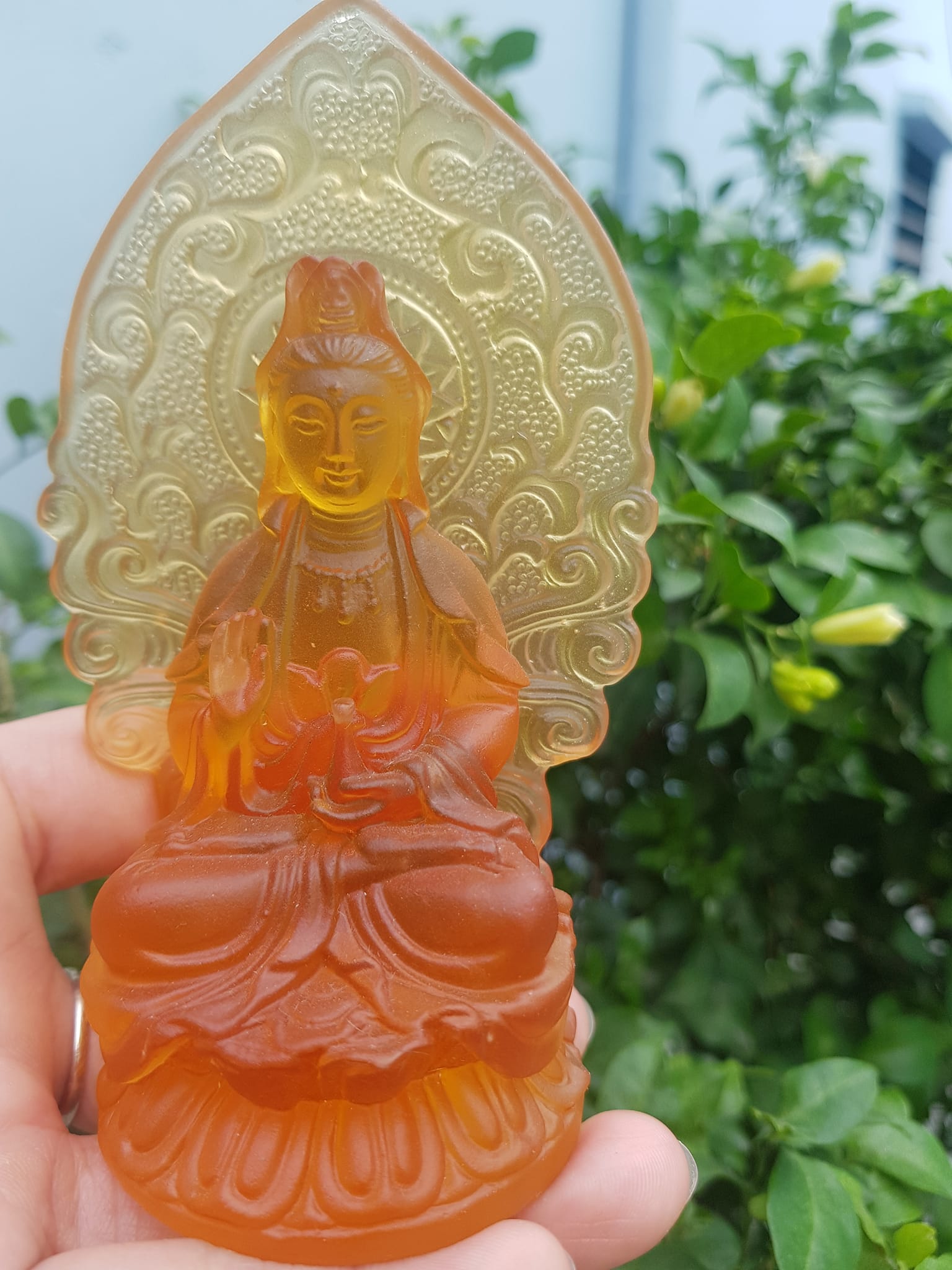 TƯỢNG PHẬT BÀ QUAN ÂM 2 MẶT ĐÁ LƯU LY VÀNG ĐẬM ĐỂ TRONG XE HƠI 10cmx6cm - HÀNG PHONG THUỶ SUNNY Q8