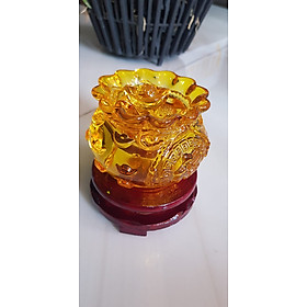 Tượng Phong Thủy Thố tụ tài mới màu vàng tài lộc 10 thỏi xiền vàng đá lưu ly tự nhiên đế gỗ size nhỏ vừa xinh đẹp đk 10cm x Cao 9cm cả đế x