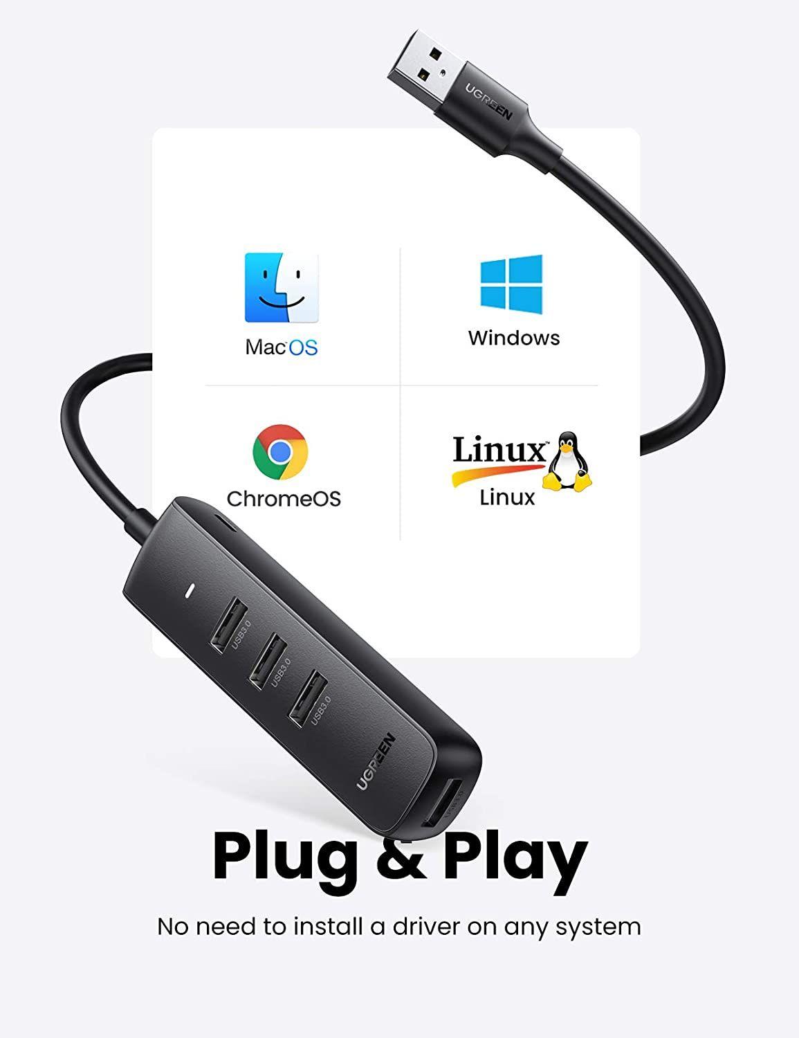 Ugreen 20277 1m 4 ports usb 2.0 hub with micro usb power port màu đen cr106 1. Input : USB-A 2. Output : 4 Port USB 2.0 . 3. Color : Black 4. Length :