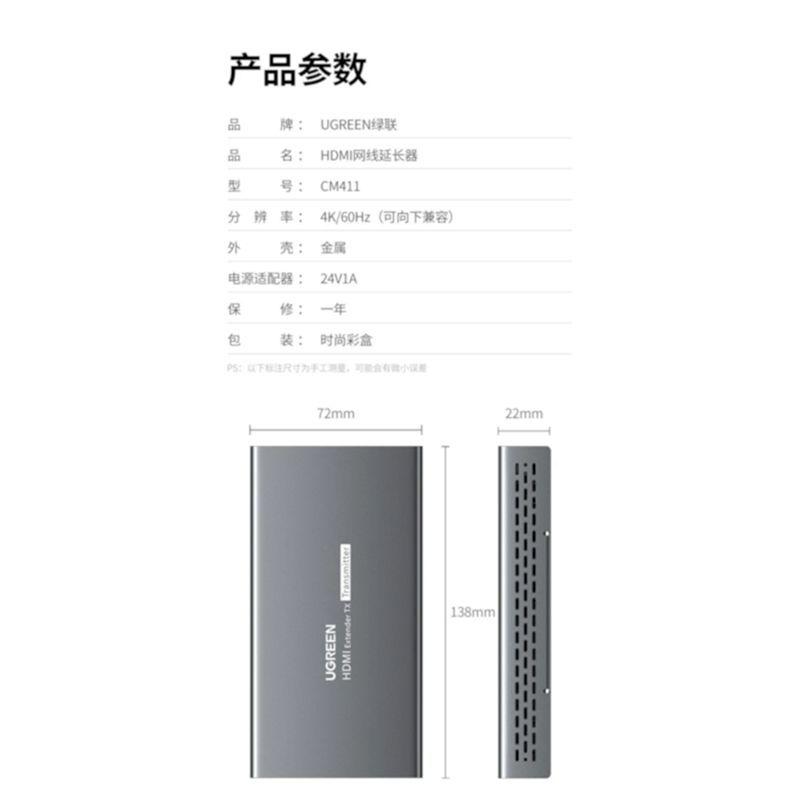 Ugreen 40283 Hdmi Single Extender Receiver 120M By Cat5E 6 With Ir Control HợP Kim KẽM Mm116 1. Features: Receiving HDMI signal through LAN network from Ugreen 40280 HDMI Transmitter 2. Signal length: 120M (CAT6)