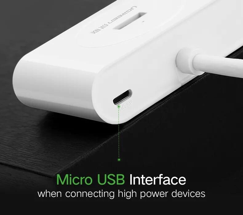 Ugreen 20277 1m 4 ports usb 2.0 hub with micro usb power port màu đen cr106 1. Input : USB-A 2. Output : 4 Port USB 2.0 . 3. Color : Black 4. Length :