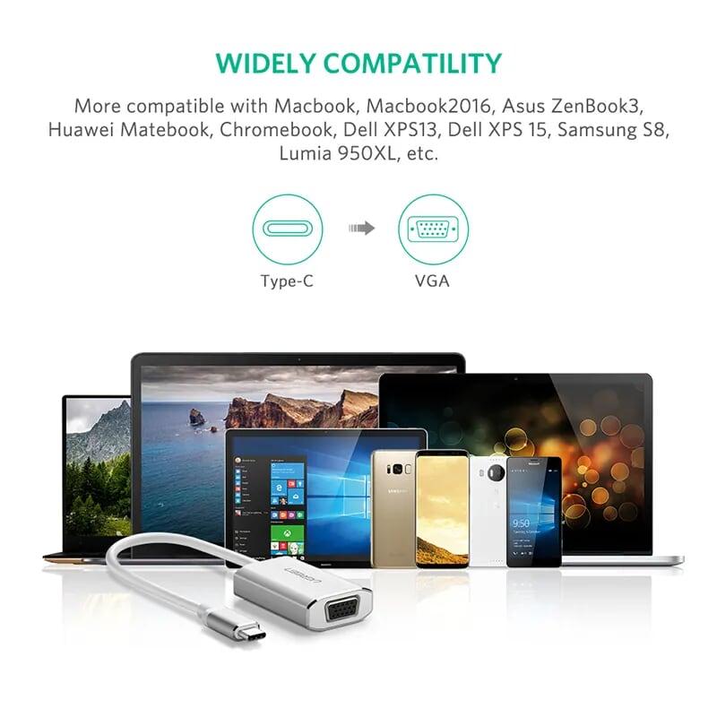 Ugreen 40866 15CM usb type c to vga converter bạc cm114 1. Features: Connect a computer, laptop with USB-C port to the monitor, VGA projector. 2. Cable length: 25cm 3. Color: Silver 4. High-class aluminum