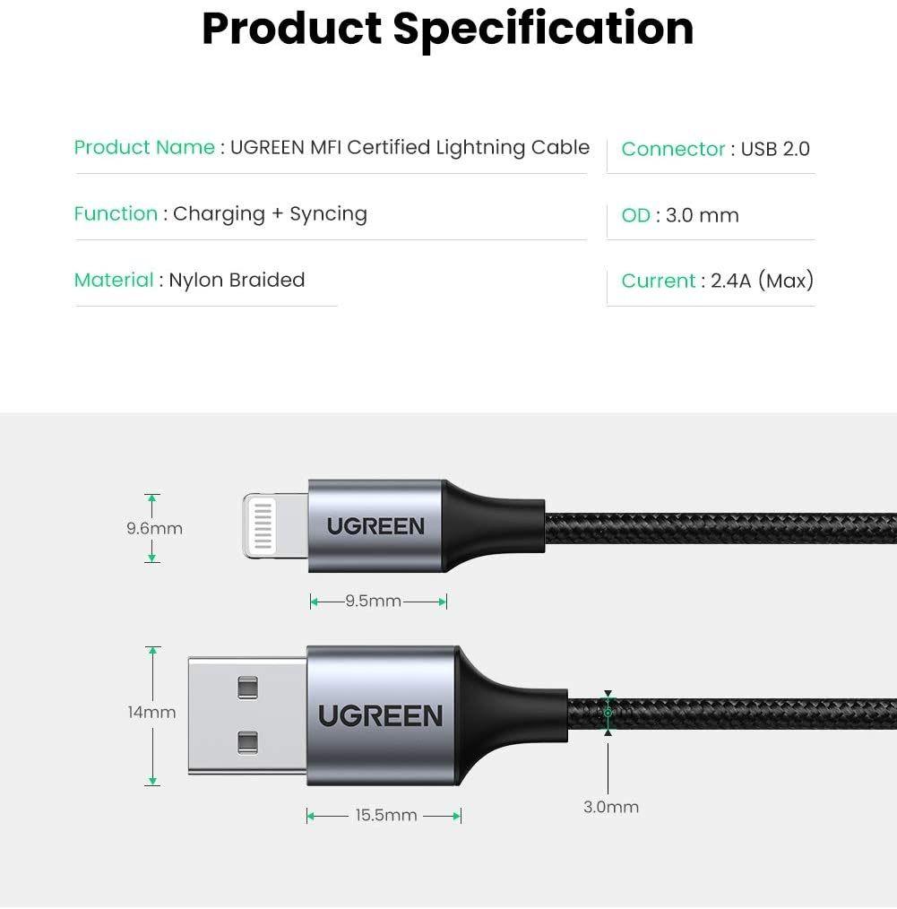 ✨Ugreen UG60154US291TK 0.25M màu đen cáp MFI USB 2.0 A ra Lightning đầu bọc nhôm mạ nickel chống nhiễu 25cm - HÀNG CHÍNH HÃNG
