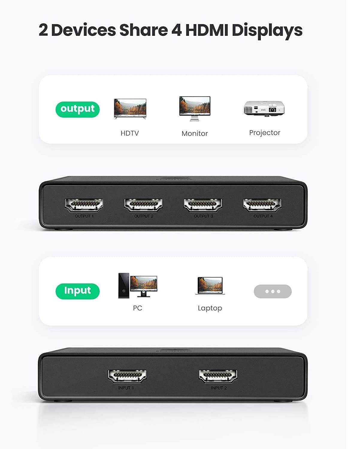 1. UGREEN 2 IN 4 OUT HDMI switcher offers an easy solution for you to share 2 devices to 4 monitors such as Mac book, PC with your HDTV for video output, saves the cables