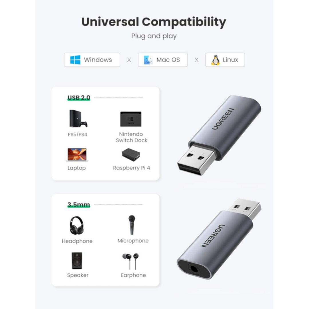 Ugreen 30724 black color usb 2.0 external sound adapter us205 1. Material: PVC+ Tinned Copper 2. Play & plug 3. Nickel plated port 4. OD: 4.0 5. Port: USB2.0 - 3.5mm 6. Color: Black 7.