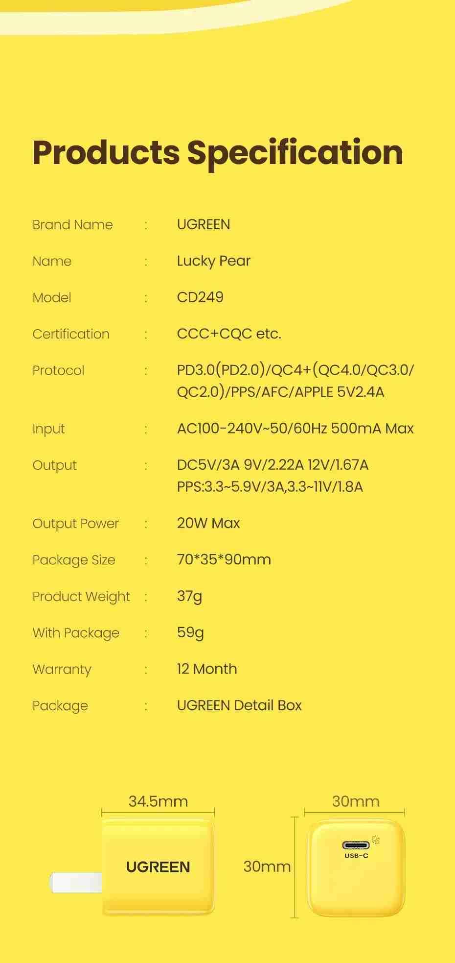 ✨Ugreen UG80947CD249TK 20W Màu Vàng Bộ Sạc nhanh USB-C QC4.0 PD 3.0 Lucky Pear - HÀNG CHÍNH HÃNG