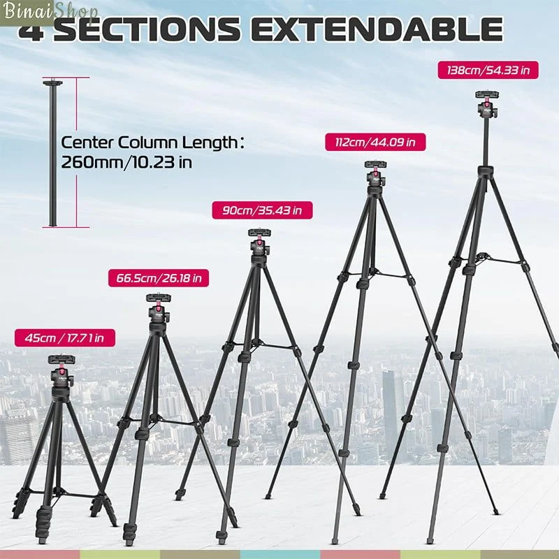 - Chiều cao có thể điều chỉnh với chân 4 đoạn và một cột trung tâm, cố định 3 chân chắc chắn bằng khóa đòn bẩy. Chiều cao mở rộng tối đa là 1380 mm.