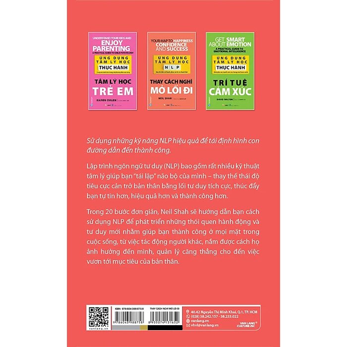 Ứng Dụng Tâm Lý Học NLP - Thay Cách Nghĩ Mở Lối Đi sử dụng những kỹ năng NLP hiệu quả để tái định hình con đường dẫn đến thành công. Lập trình ngôn ngữ tư duy (NLP) bao gồm rất nhiều kỹ thuật tâm lý giúp bạn “tái lập” não bộ của mình – thay thế thái độ tiêu cực cản trở bản thân bằng lối tư duy tích cực, thúc đẩy bạn tự tin hơn, hiệu quả hơn và thành công hơn. Trong 20 bước đơn giản, Neil Shah sẽ hướng dẫn bạn cách sử dụng NLP để phát triển những thói quen hành động và tư duy mới nhằm giúp bạn thành công ở mọi mặt trong cuộc sống, từ việc tác động người khác, nắm được cách họ ảnh hưởng đến mình, quản lý căng thẳng cho đến việc vươn tới mục tiêu của bản thân.