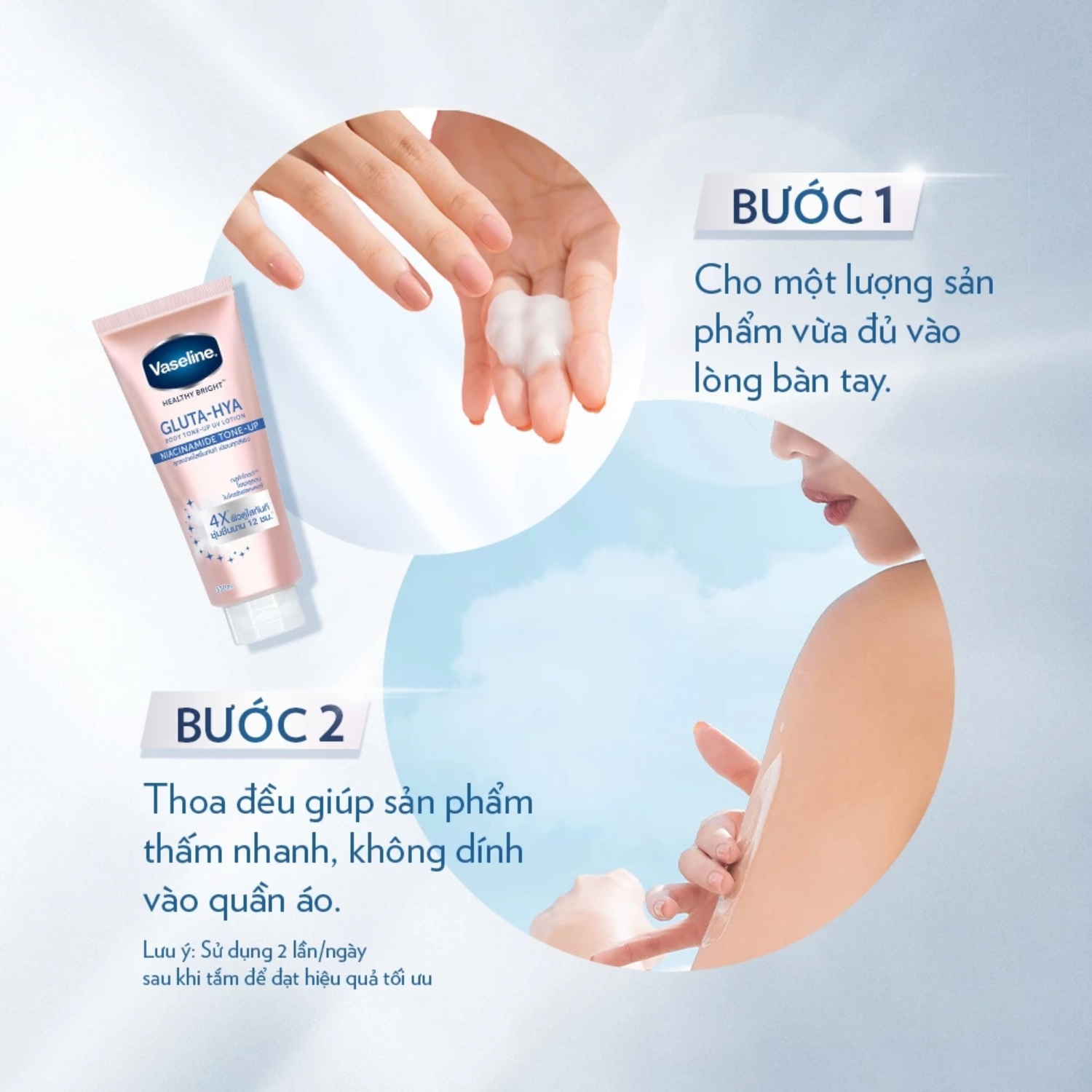 Sữa dưỡng thể ban đêm Vaseline Gluta-Hya Serum Burst Lotion Dewy Radiance Thành phần chính: + Giải pháp GlutaGlow: có khả năng làm sáng da hơn gấp 10X+ so với Vitamin C. + Gấp 10X*