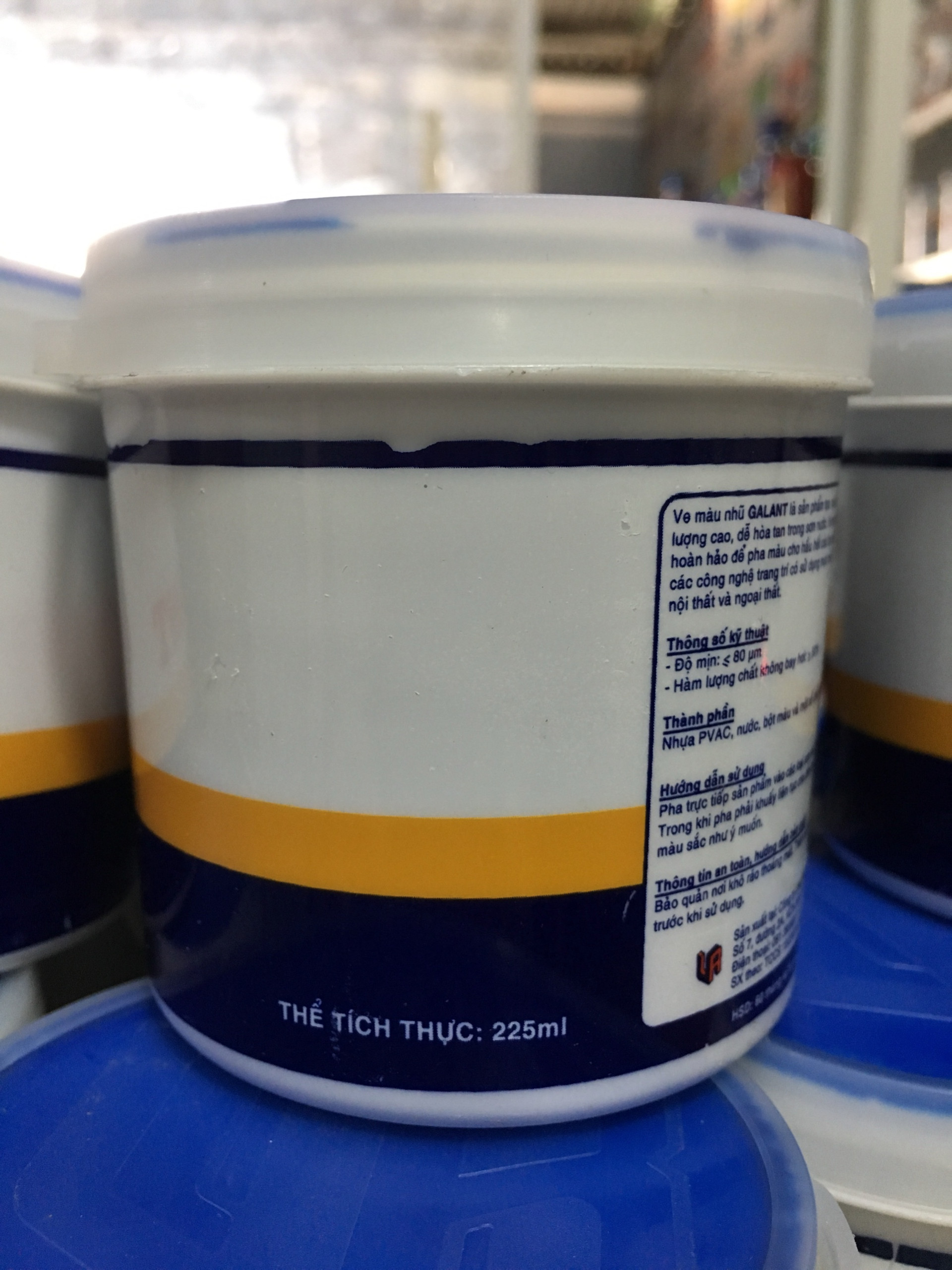 Mua tại TiktokVE MÀU XANH DƯƠNG GALANT SP320 - Đơn vị tính: 1 két gồm 12 lon - Ve màu nhũ Galant là sản phẩm hoàn hảo để pha màu cho hầu hết các loại sơn nước và còn dùng trong các công nghệ trang trí có sử dụng mực màu. - Thành phần: Nhựa PVAC, nước, bột màu và một số chất khác. - Đóng gói: 225ml/lon. - Hướng dẫn sử dụng: Pha trực tiếp sản phẩm vào các loại sơn nhũ gốc nước theo màu ưa thích. Trong khi pha phải khuấy liên tục cho đến khi màu sơn đều và có được màu sắc như ý muốn. Sản phẩm được phân phối bởi: Công ty TNHH Lộc Nam Việt 1933, QL51, Phước Tân, Biên Hòa, Đồng Nai '0948 79 5588'