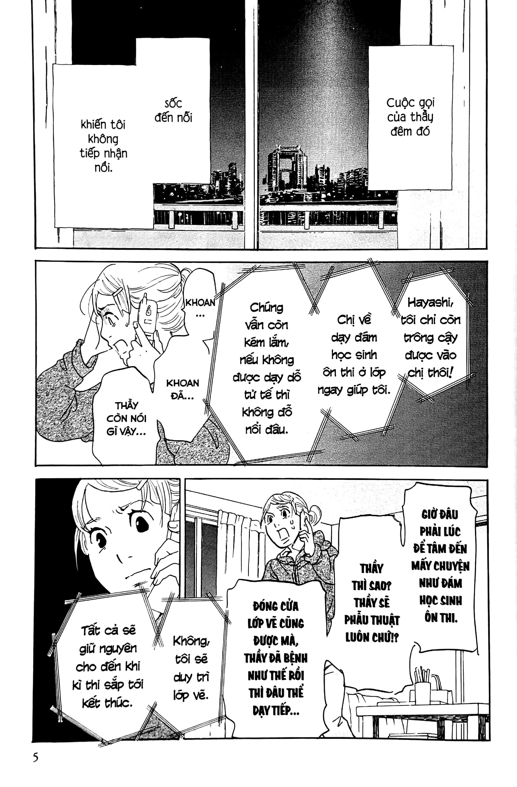 Mua tại TiktokBất ngờ nhận được tin báo rằng thầy Hidaka chỉ còn sống được bốn tháng nữa, Akiko bỏ dở công việc vẽ truyện và tức tốc trở về Miyazaki với quyết tâm tiếp quản lớp vẽ giúp thầy. Nhưng những khó khăn trong công việc ập tới khiến quyết tâm của Akiko nhanh chóng sụp đổ, và chẳng mấy chốc cô phải quay lại Osaka để tiếp tục vẽ truyện. Cứ thế, guồng quay công việc và những tháng ngày vui vẻ bên bạn bè cùng người yêu đã khiến Akiko chẳng còn tâm trí nhớ tới thầy. Cho đến một ngày, cô nhận được cuộc gọi mà mình không hề muốn nghe. Khi nhấc máy… Đây là tập cuối của bộ hồi ký về chính cuộc đời tác giả Akiko Higashimura, chứa đựng những xúc cảm, những tiếc nuối, và là lời tâm sự cô muốn gửi đến người thầy năm xưa của mình.