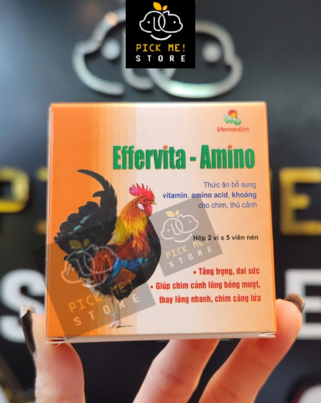 Mua tại TiktokTHÀNH PHẦN NGUYÊN LIỆU Vitamin A, D3, E, B1, B2, B3 (vitamin PP, nicotinamide), B5 (Calcium pantothenate), B6, B9 (folic acid), B12, C, K3, Lysine, Methionine, Sodium chloride, Sodium sulfate, Iron sulfate, Magnesium sulfate, Manganese sulfate, Zinc sulfate, Potassium chloride. CÔNG DỤNG Effervita-Amino chứa đầy đủ và cân đối các vitamin, khoáng và amino acid, là dưỡng chất rất cần thiết cho các loài chim, thú cảnh,...