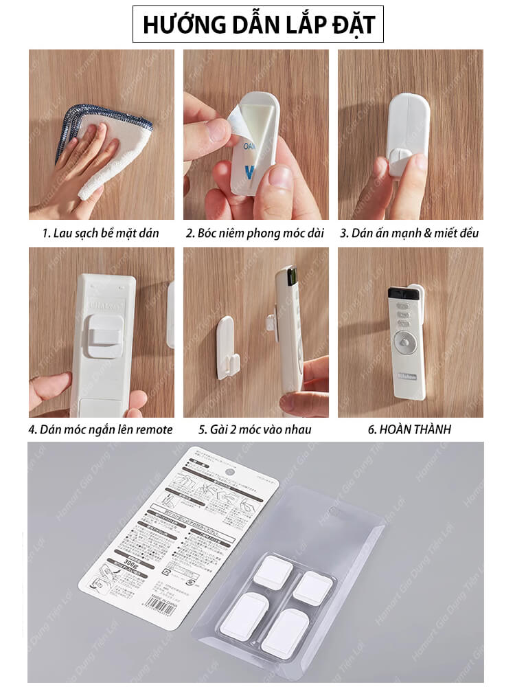 - Bộ móc treo gồm : 1 móc dài gắn tường và 1 móc ngắn gắn điều khiển để gài lên tường